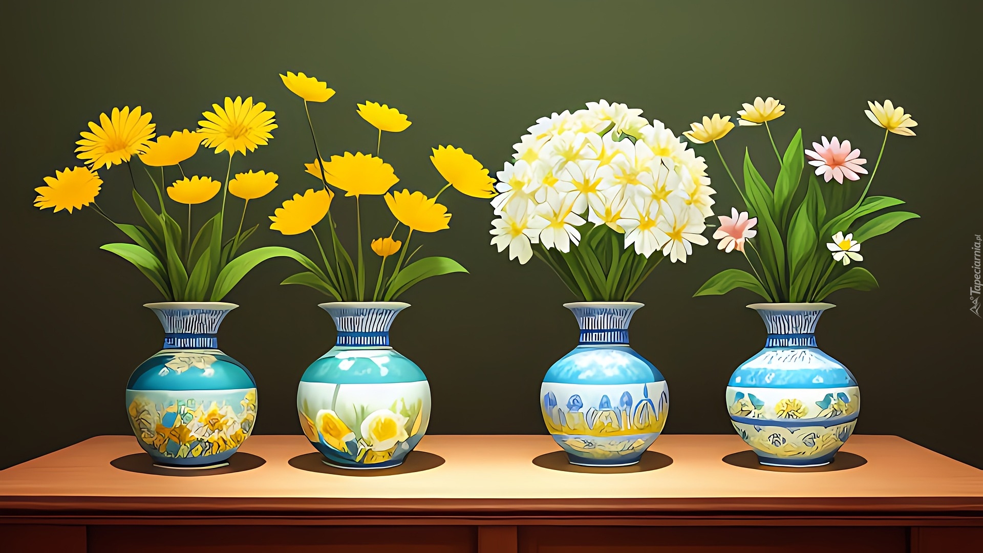Edytor tapety: Kwiaty w czterech malowanych wazonach w grafice