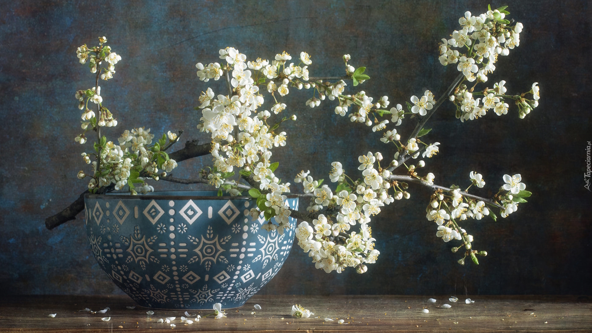 Edytor tapety: Gałązka okwieconej wiśni w misie