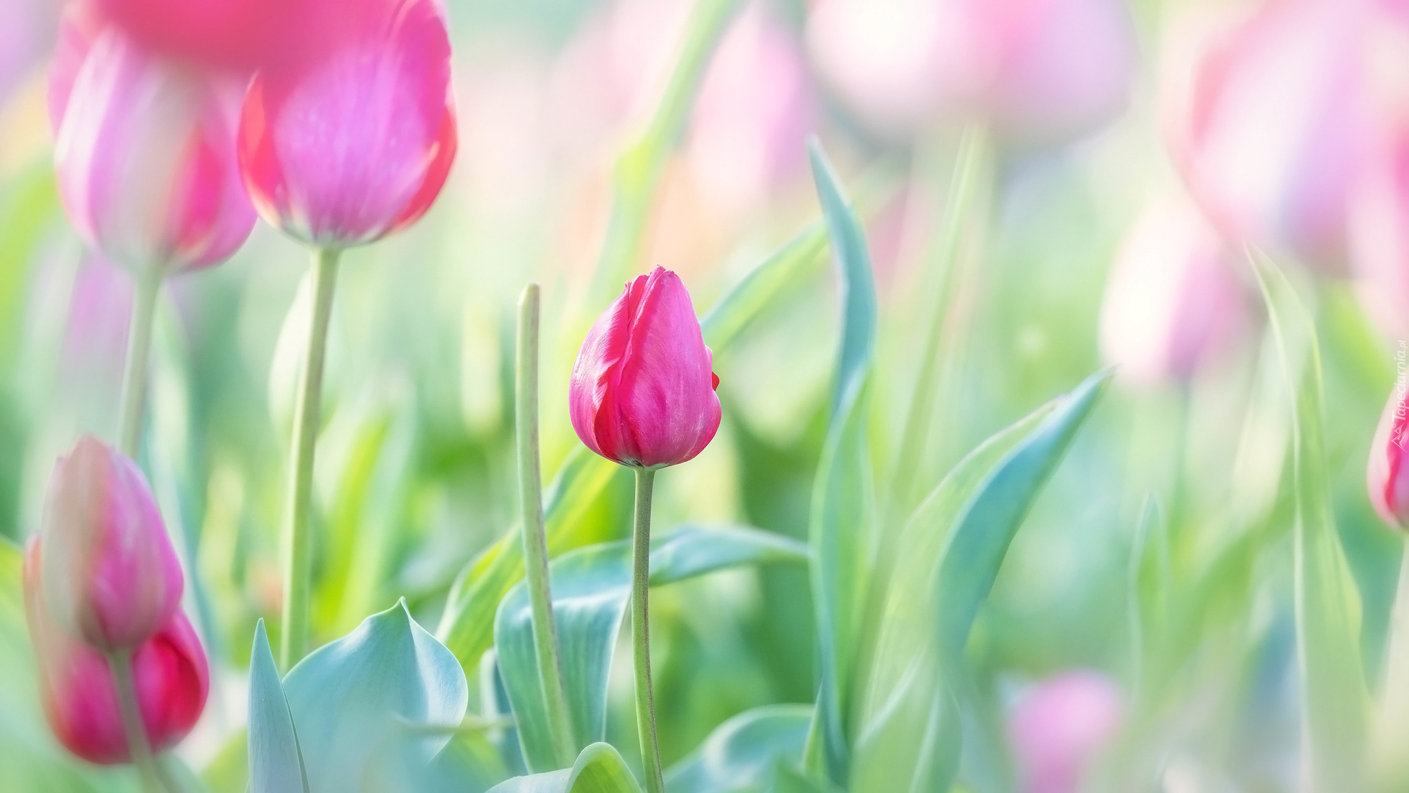 Edytor tapety: Różowe tulipany i rozmyte tło