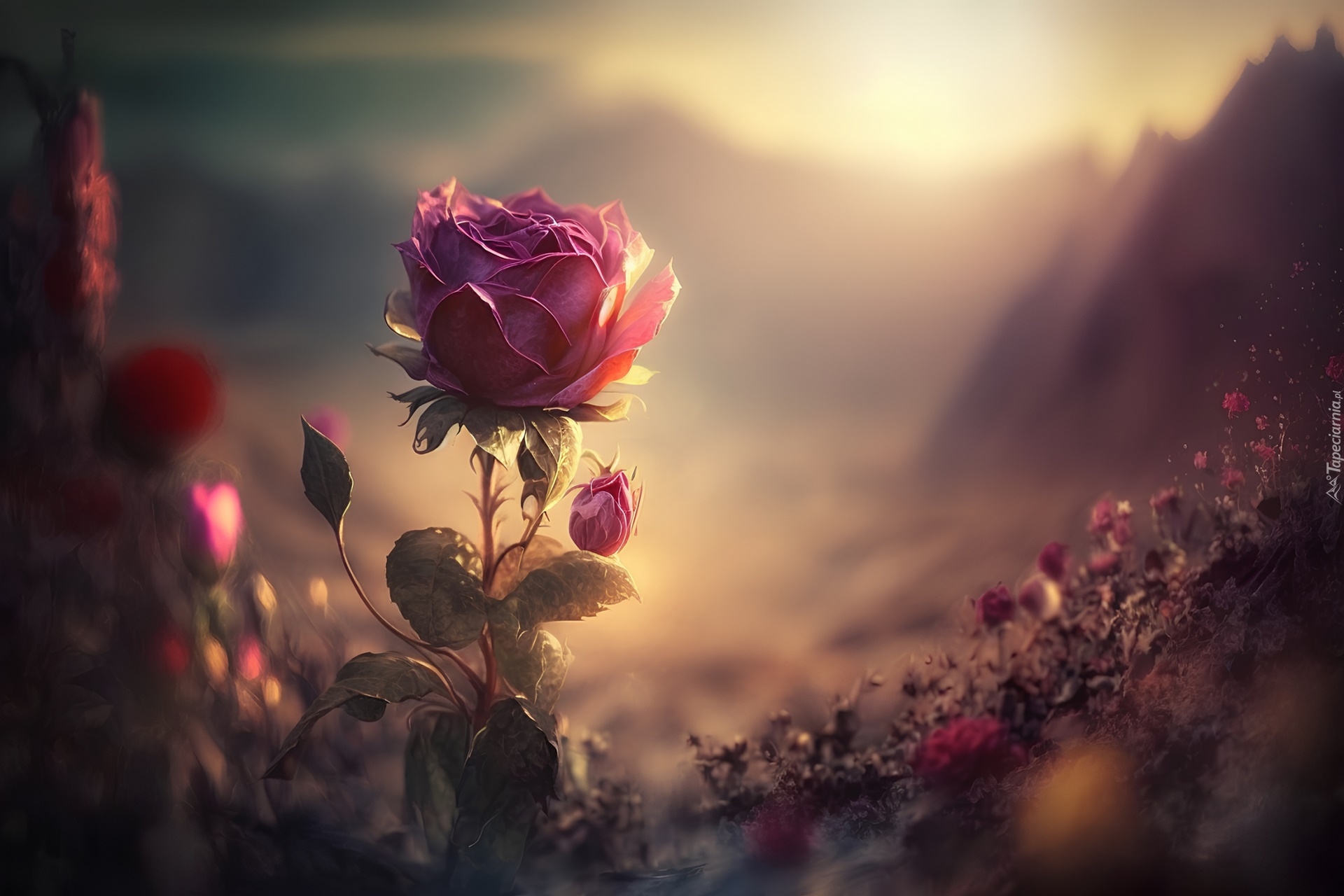 Edytor tapety: Rozświetlona róża z pąkami w grafice