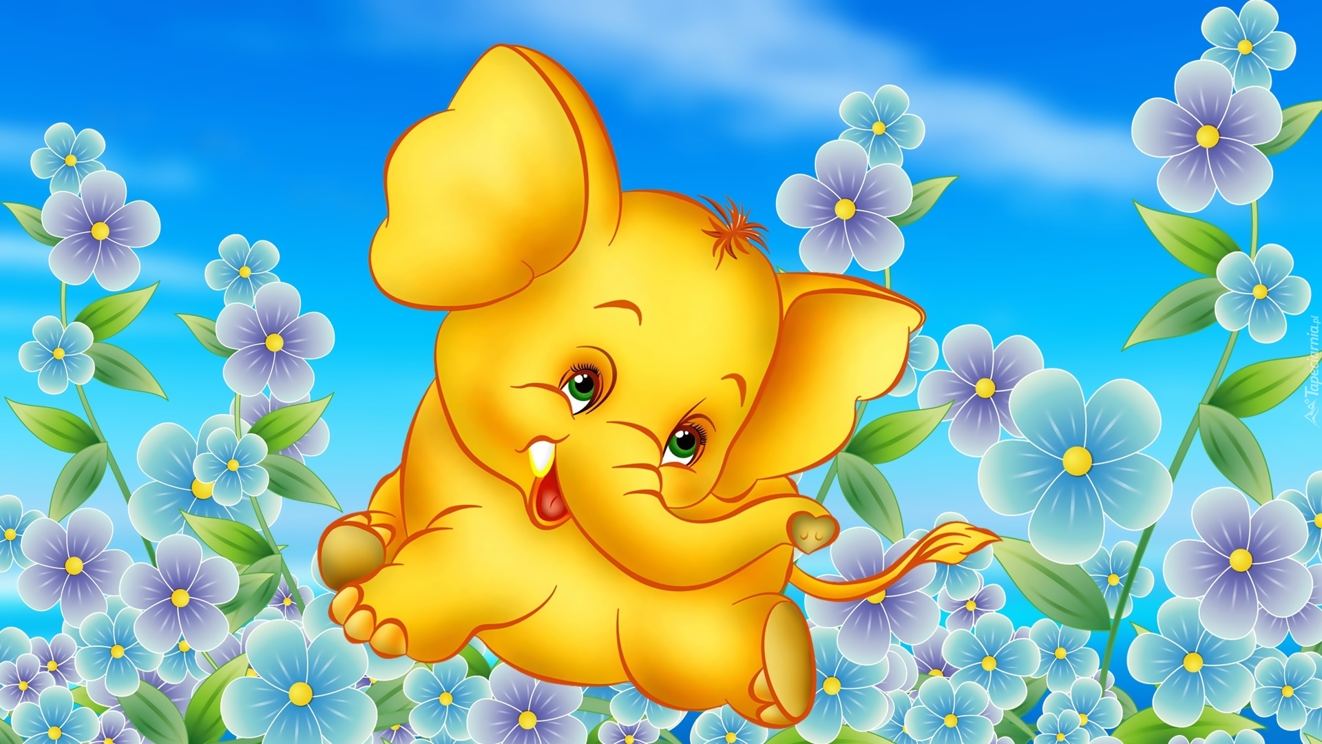Edytor tapety: Żółty słonik wśród kwiatów w 2D