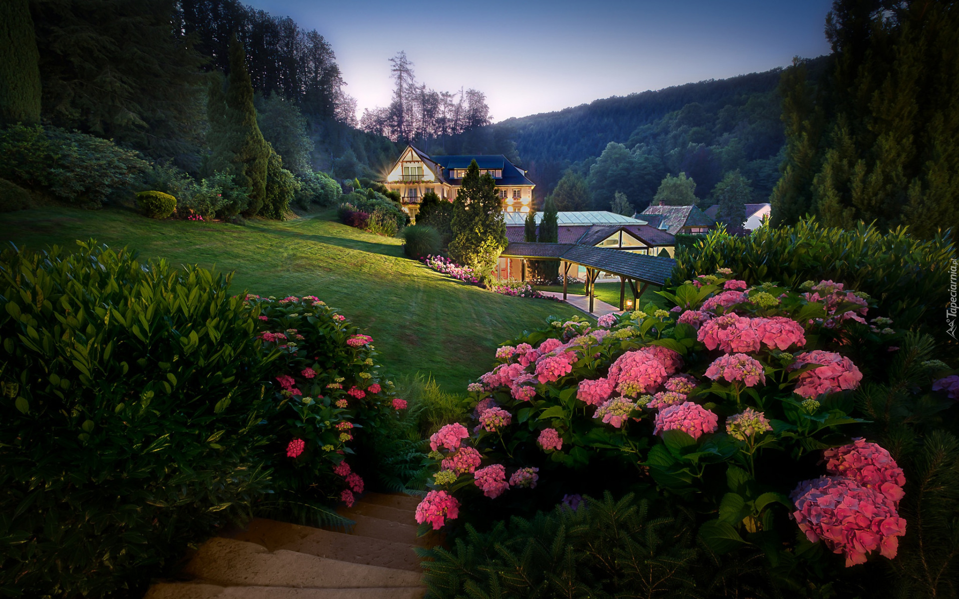 Edytor tapety: Hortensje i oświetlony dom na wzgórzu o zmierzchu