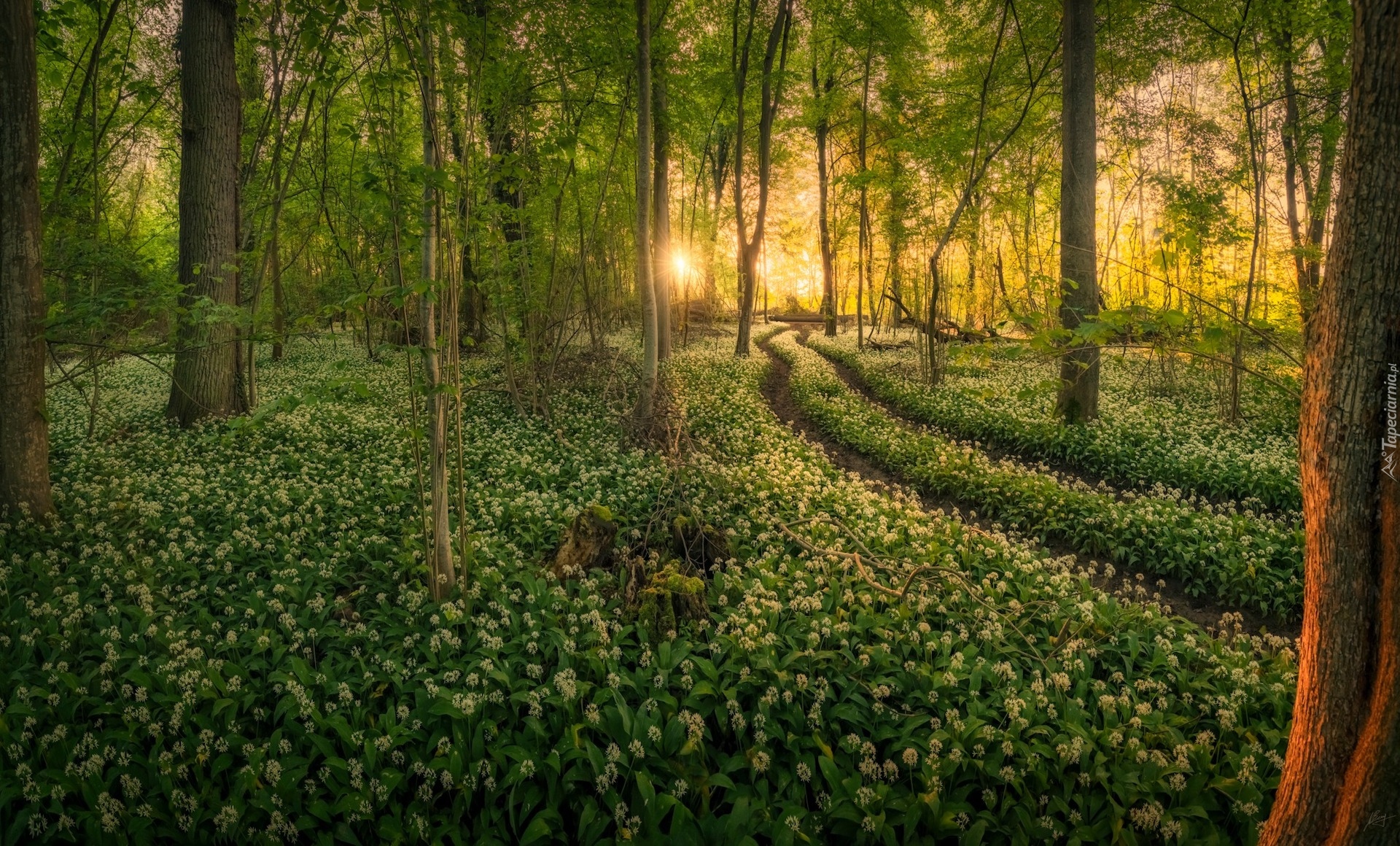 Edytor tapety: Rozświetlony promieniami słońca czosnek niedźwiedzi w lesie