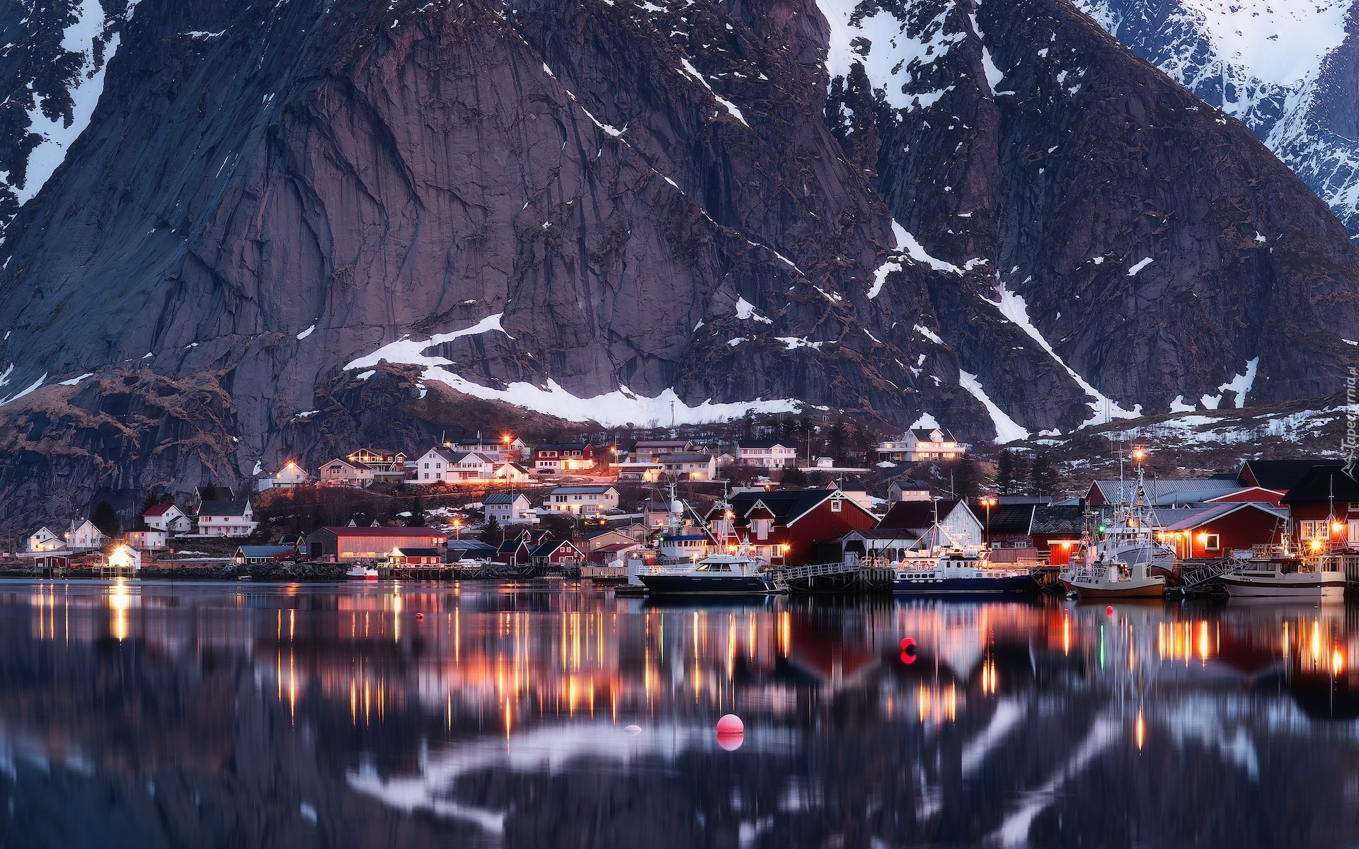 Edytor tapety: Oświetlone domy na Lofotach zimową porą