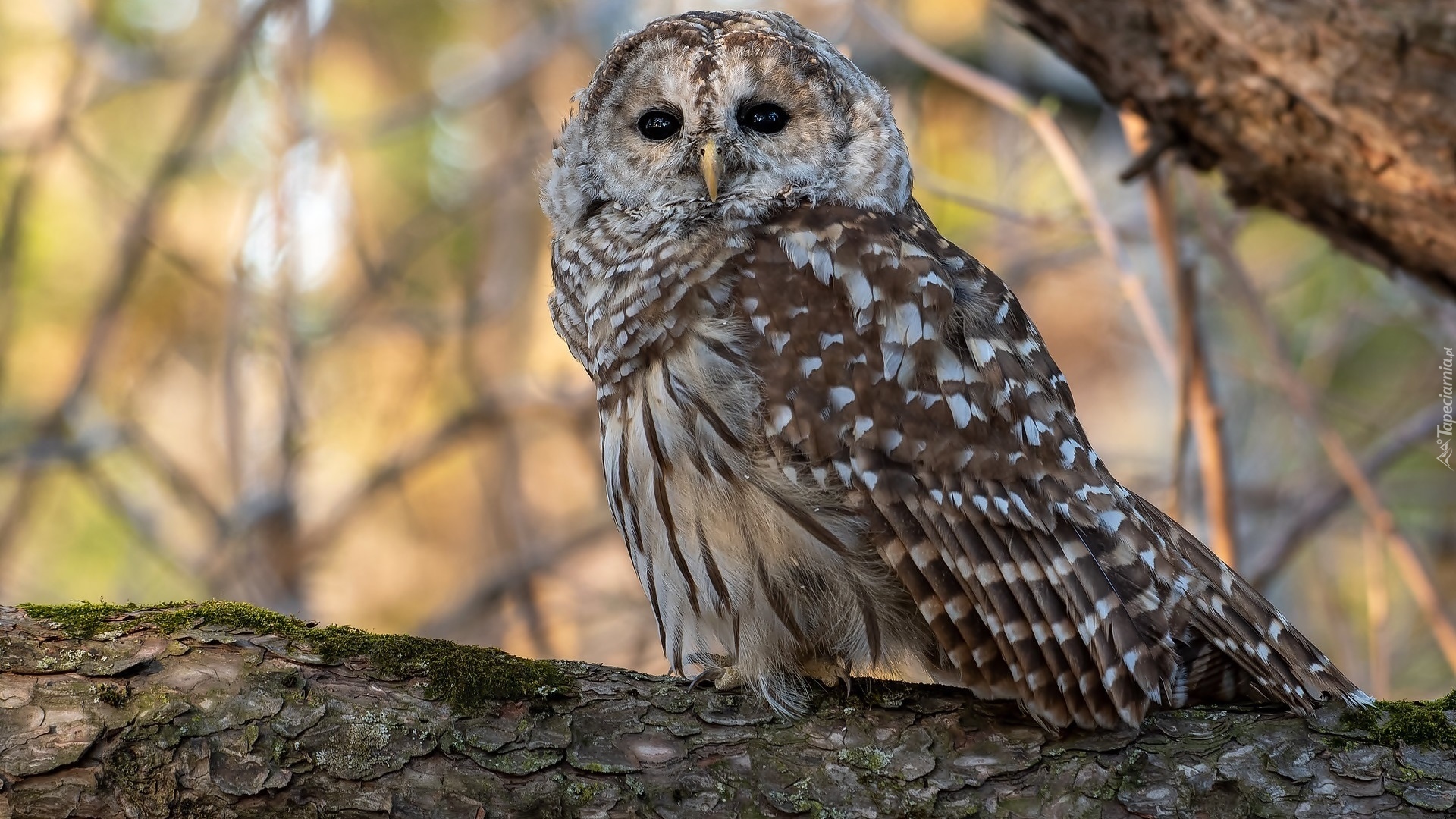 Edytor tapety: Puszczyk kreskowany na konarze drzewa