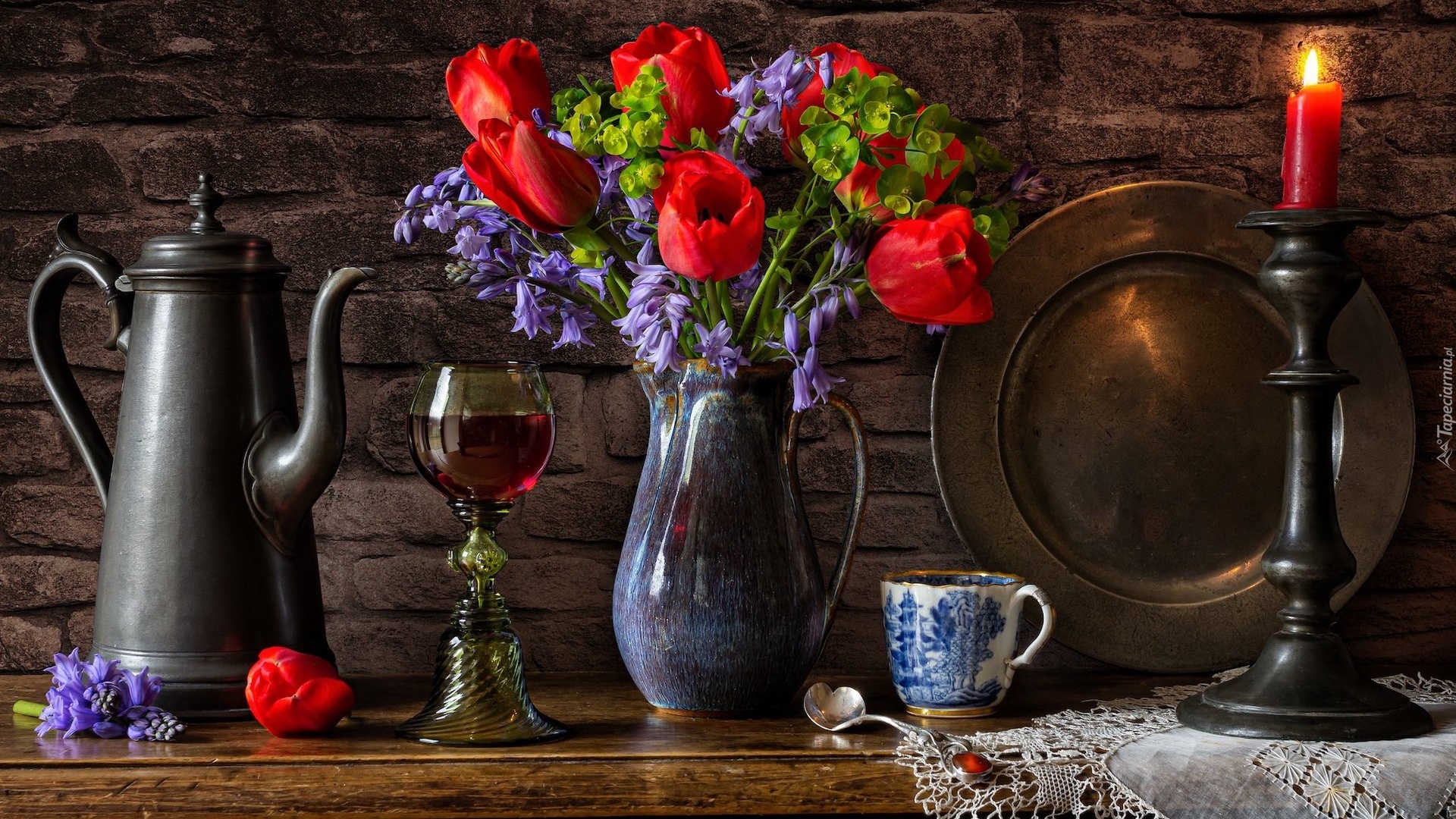 Edytor tapety: Bukiet kwiatów obok świecy i dzbanka