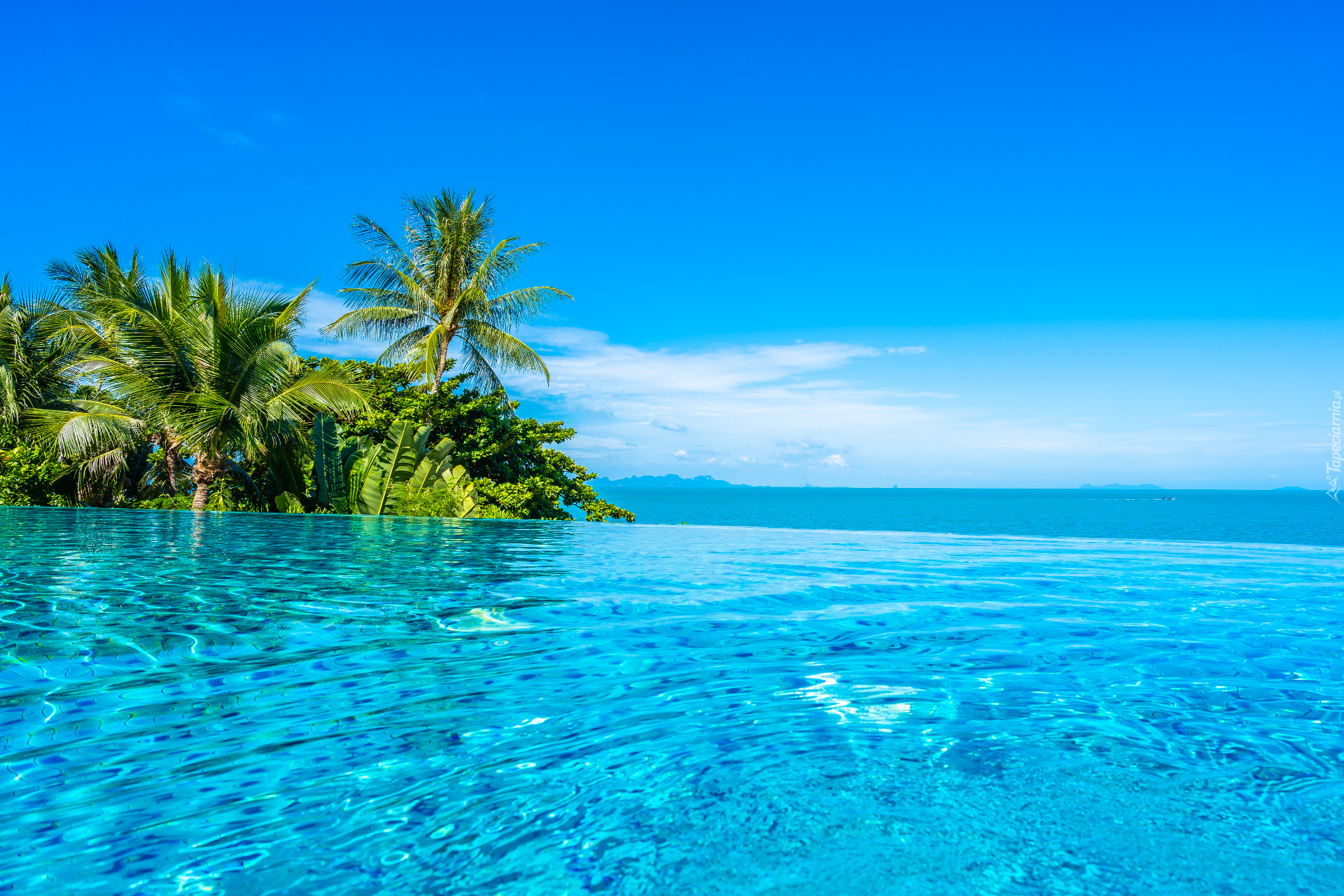 Edytor tapety: Widok z basenu na palmy i morze