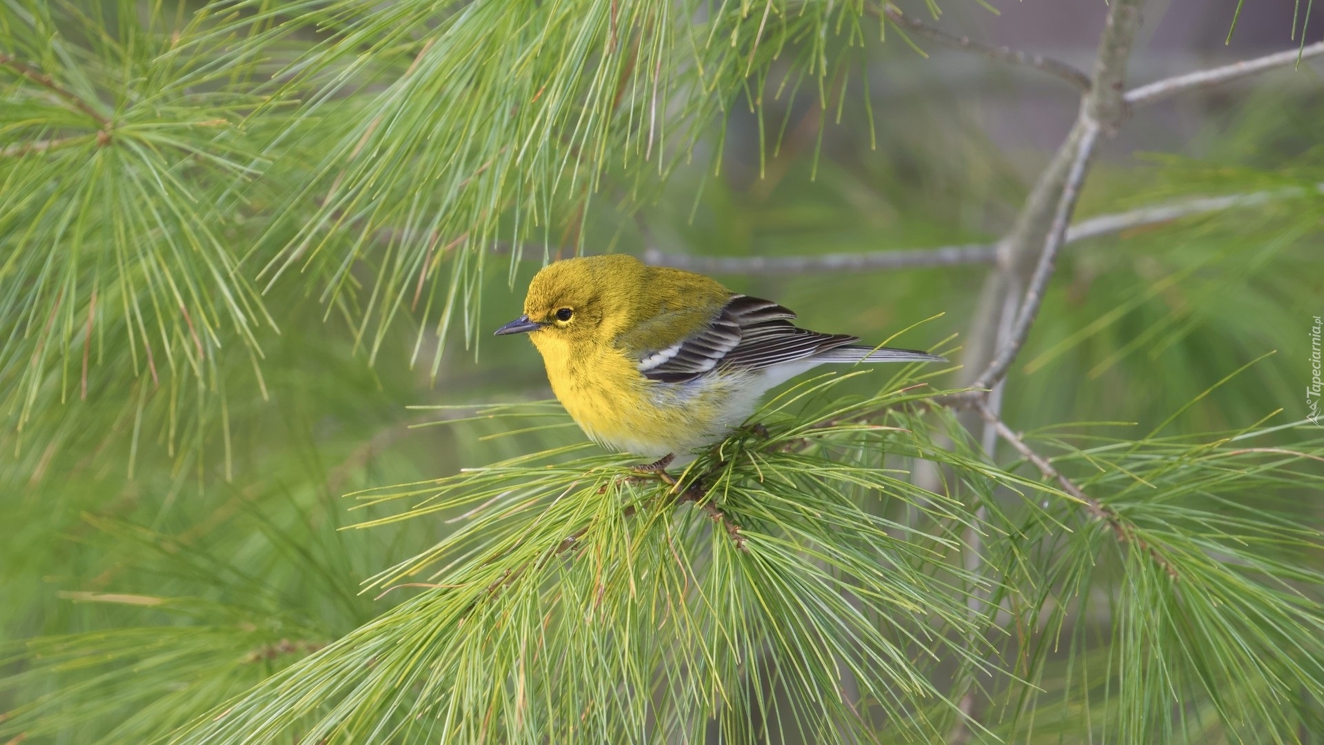 Edytor tapety: Lasówka sosnowa na gałązce sosny