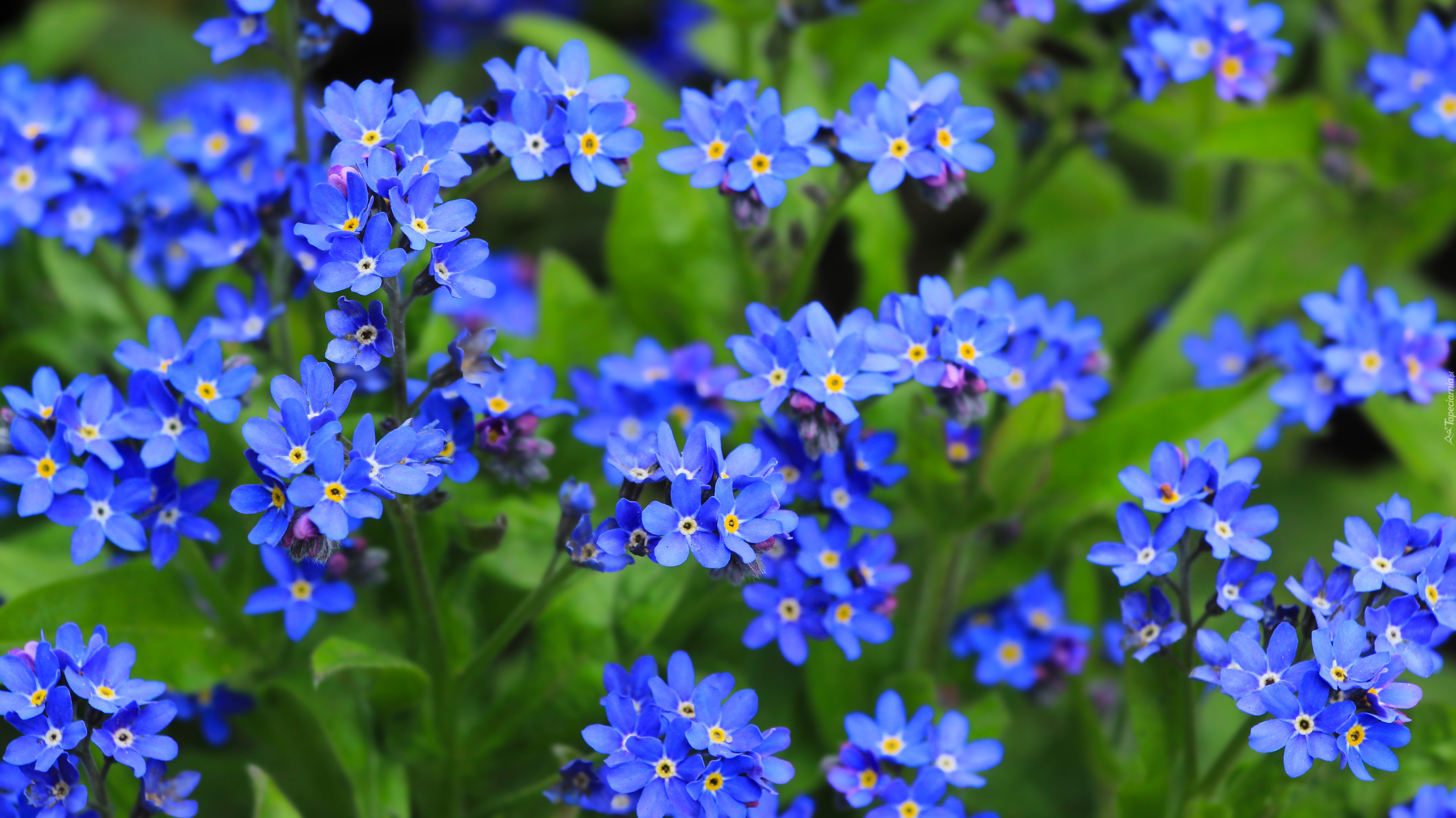 Edytor tapety: Niebieskie niezapominajki z listkami w zbliżeniu