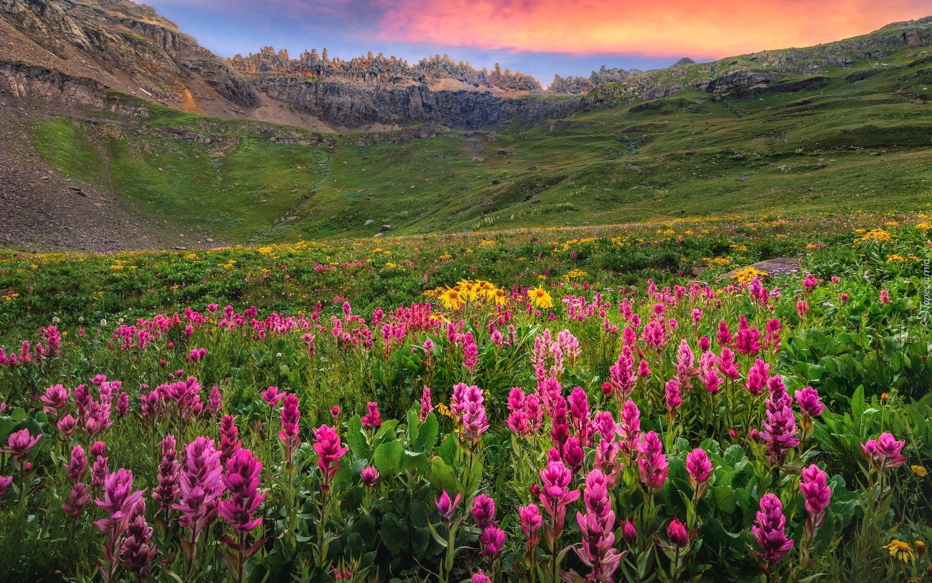 Edytor tapety: Wzgórza i kwiaty na łące