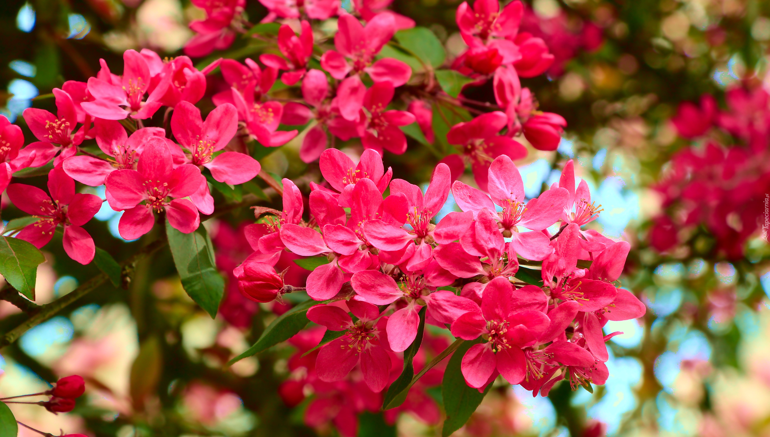 Edytor tapety: Czerwone kwiaty drzewa owocowego w zbliżeniu