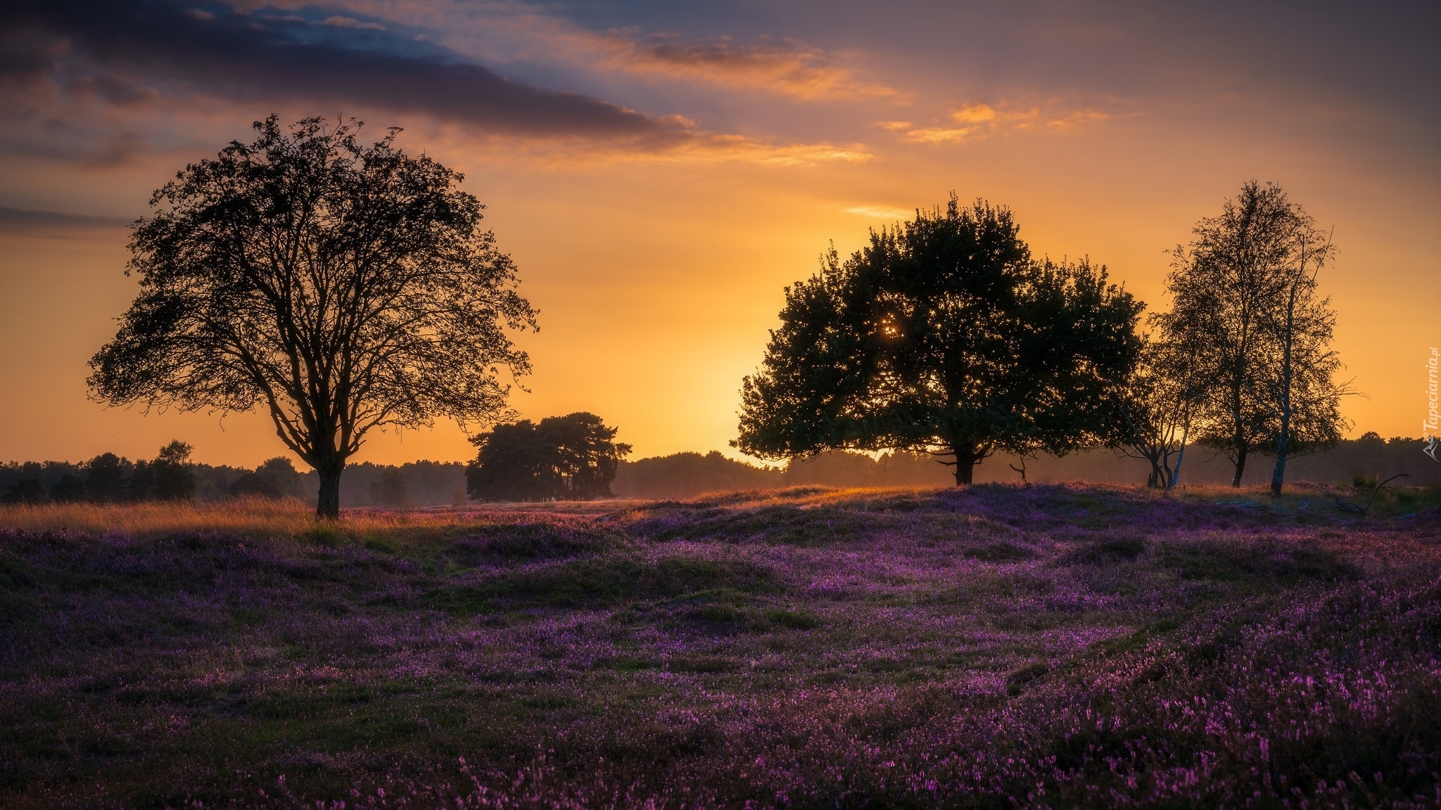 Edytor tapety: Drzewa na wrzosowisku o zmierzchu