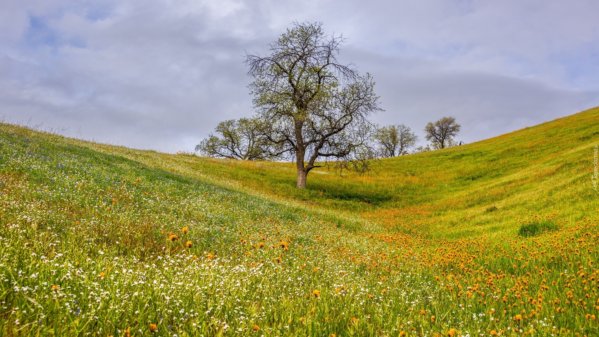 Edytor tapety: Ukwiecona łąka i drzewa na wzgórzu