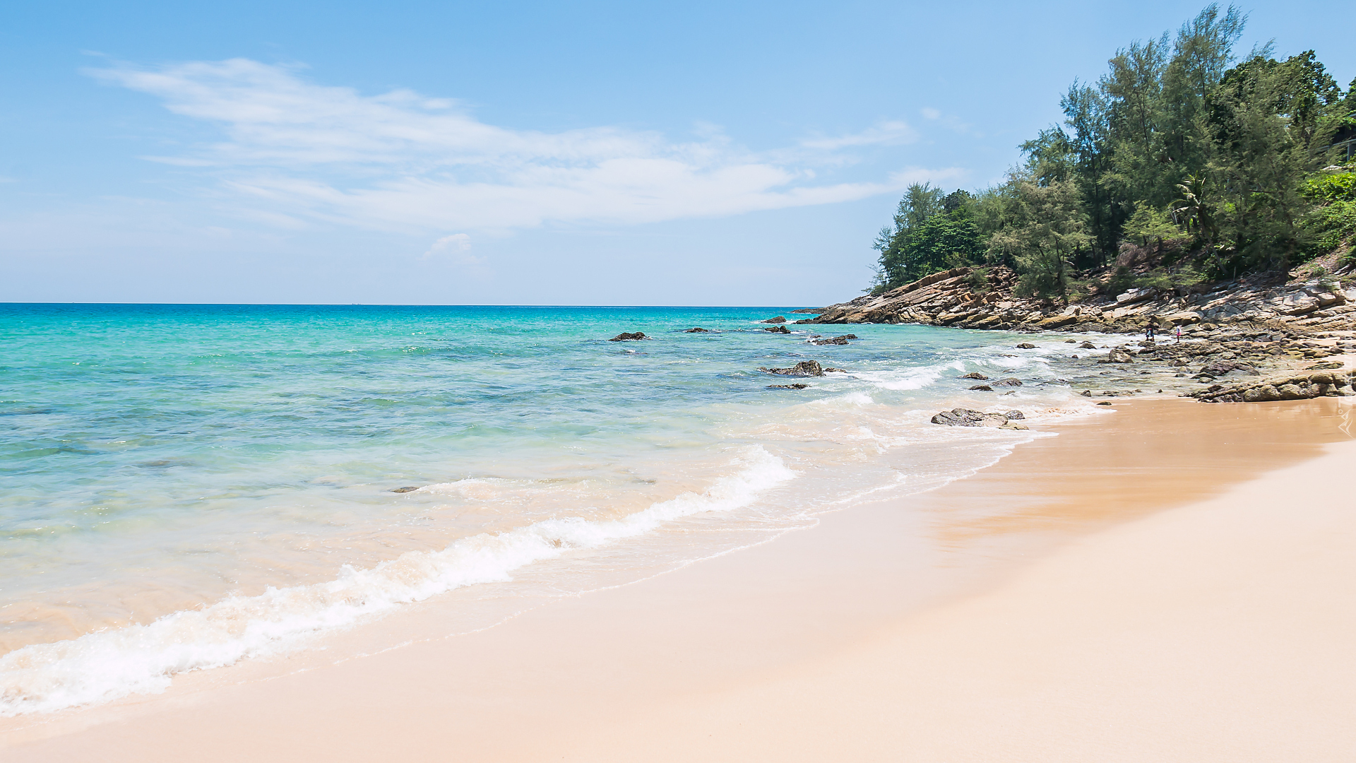 Edytor tapety: Drzewa i skały na morskiej plaży