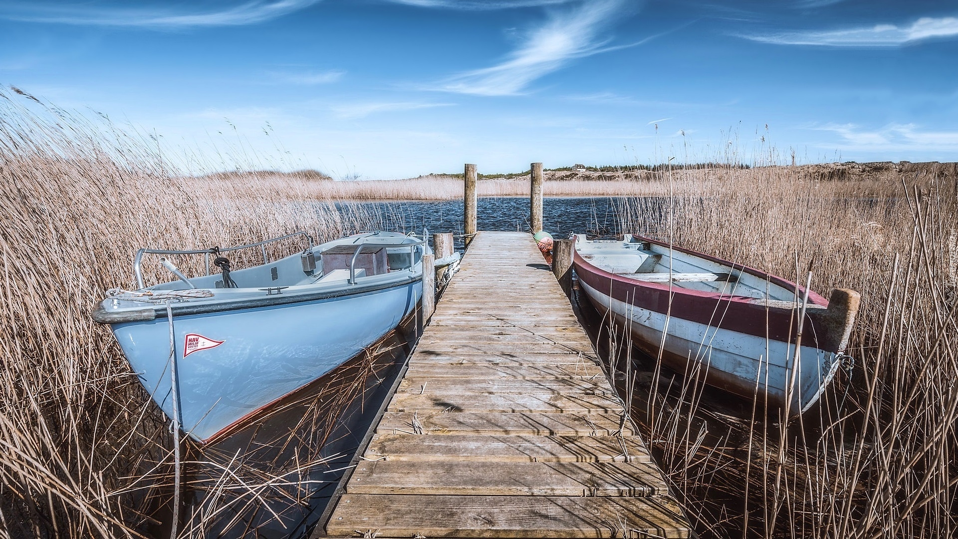 Edytor tapety: Łodzie w szuwarach przy pomoście na jeziorze