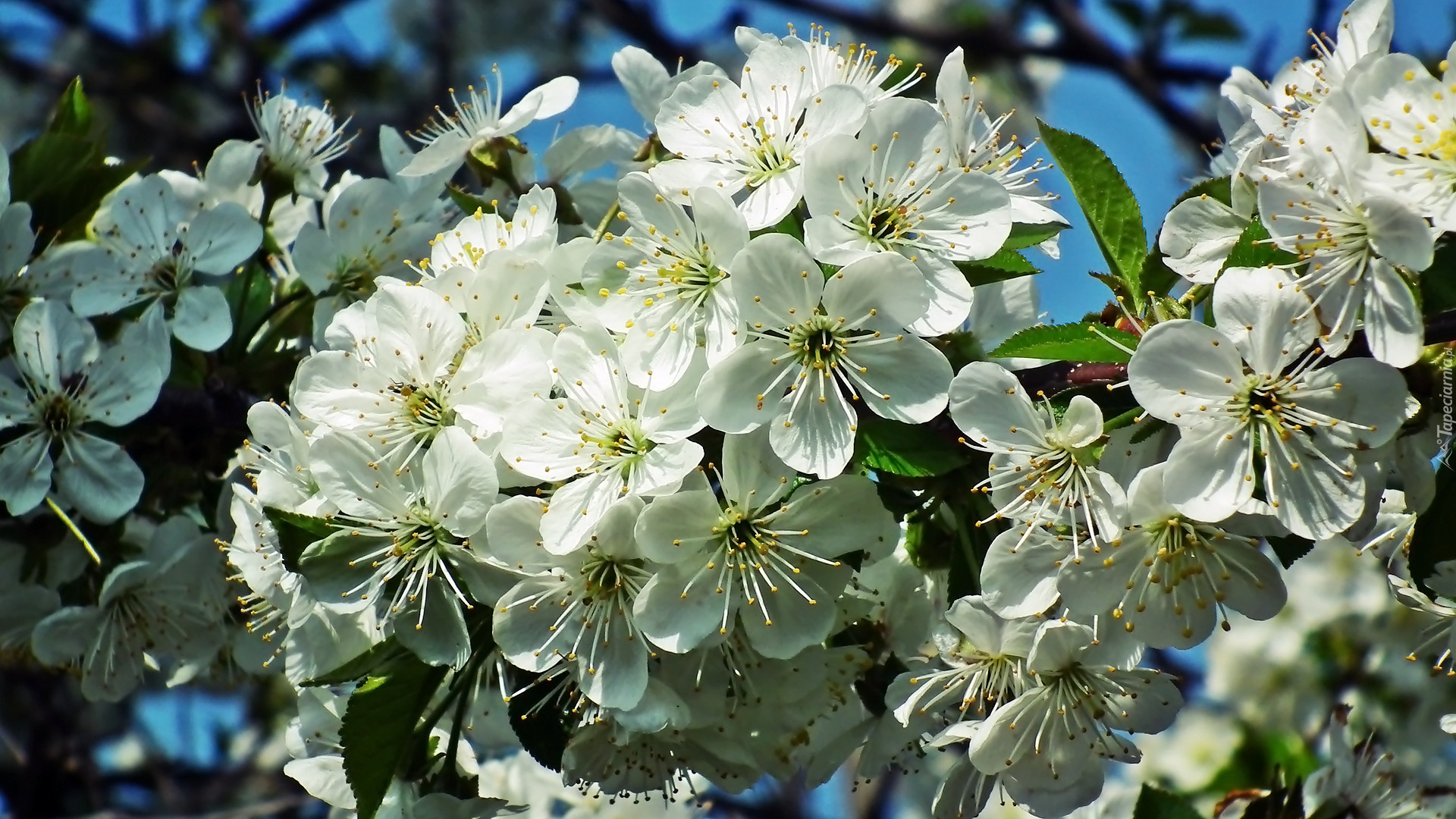 Edytor tapety: Białe kwiaty wiśni w słonecznym blasku