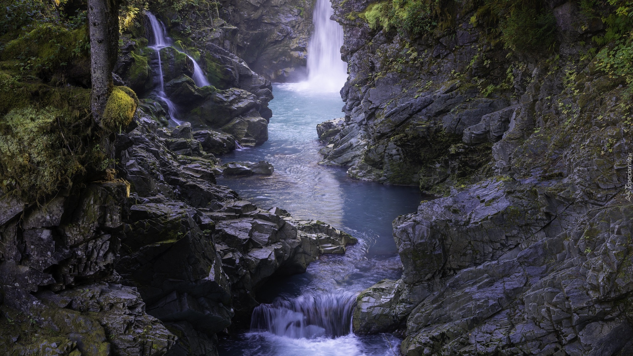 Edytor tapety: Wodospad i rzeka między skałami