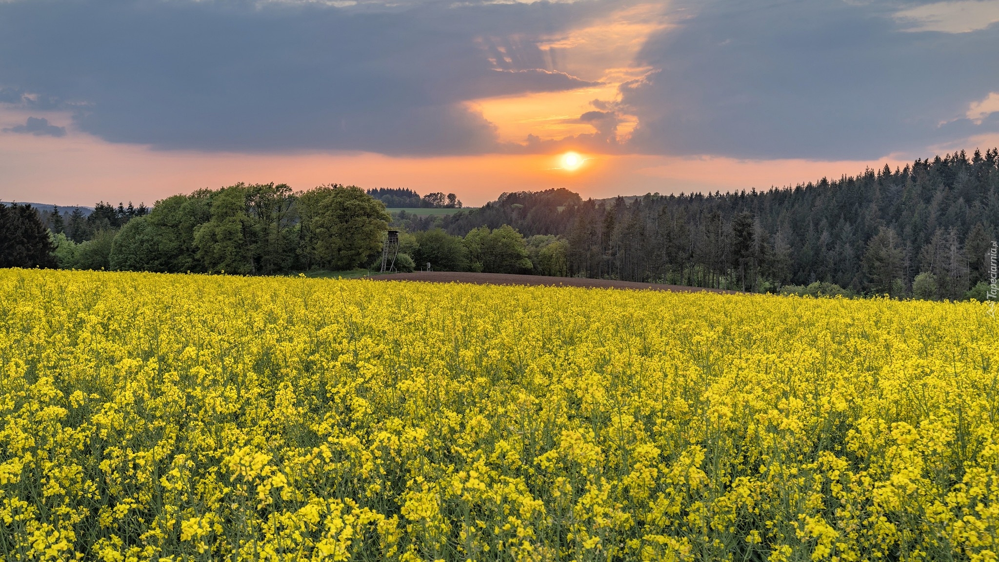 Edytor tapety: Pole rzepaku pod lasem o zachodzie słońca