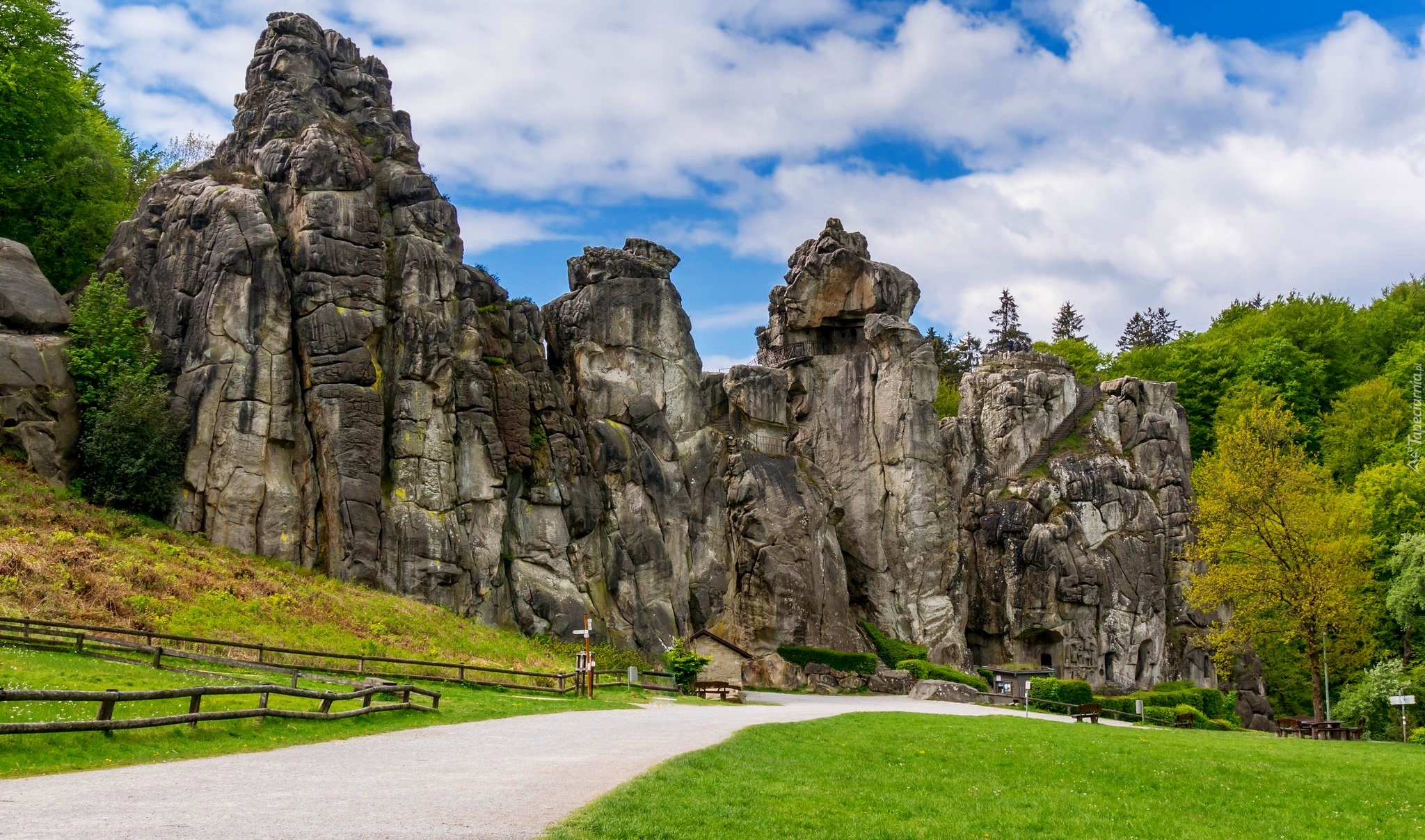 Edytor tapety: Ogrodzona droga przy formacji skalnej Externsteine w Niemczech