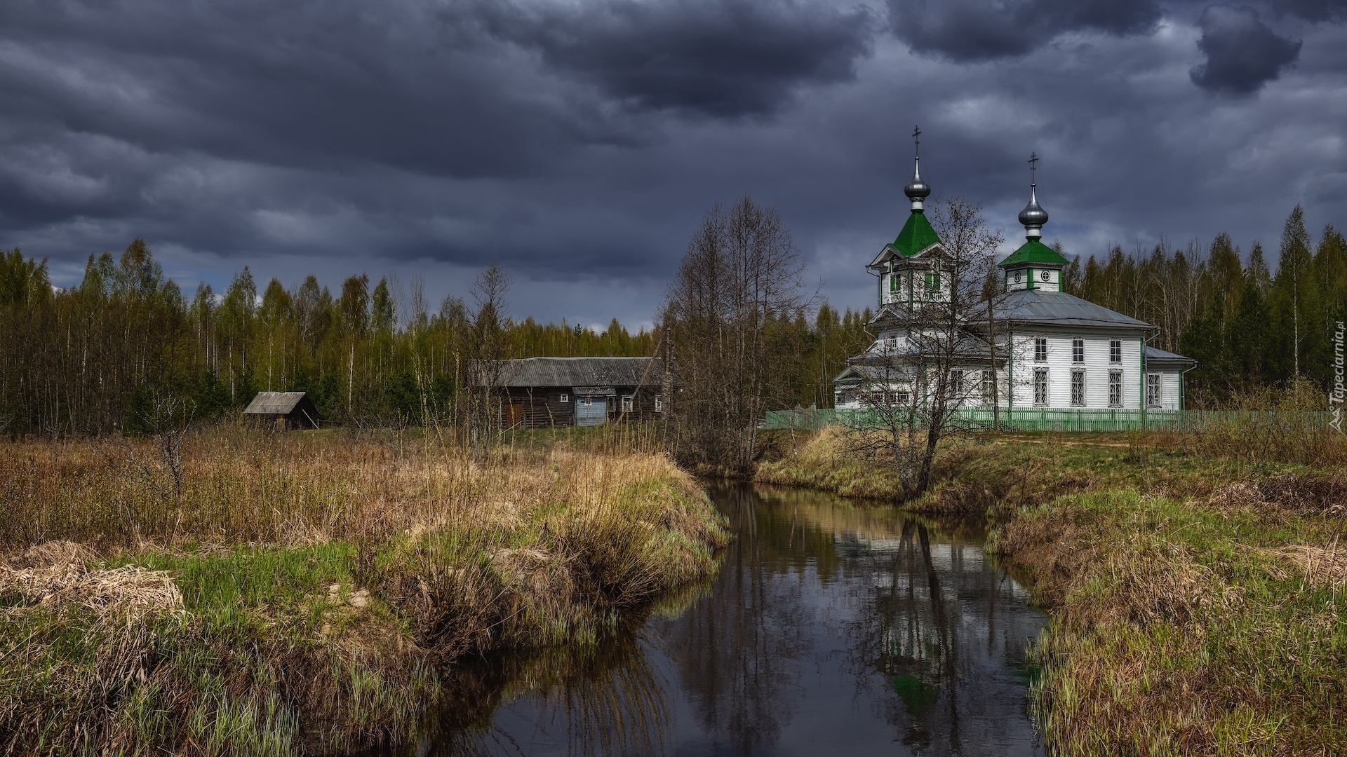 Edytor tapety: Cerkiew nad rzeką pod ciemnymi chmurami