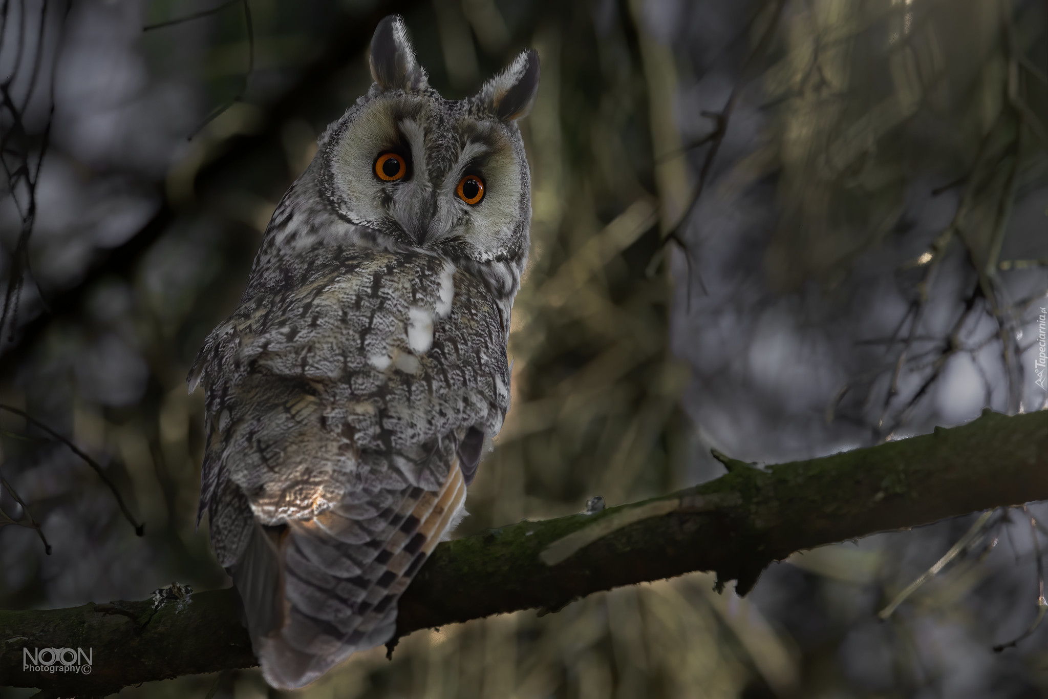 Edytor tapety: Uszatka zwyczajna siedząca na gałęzi