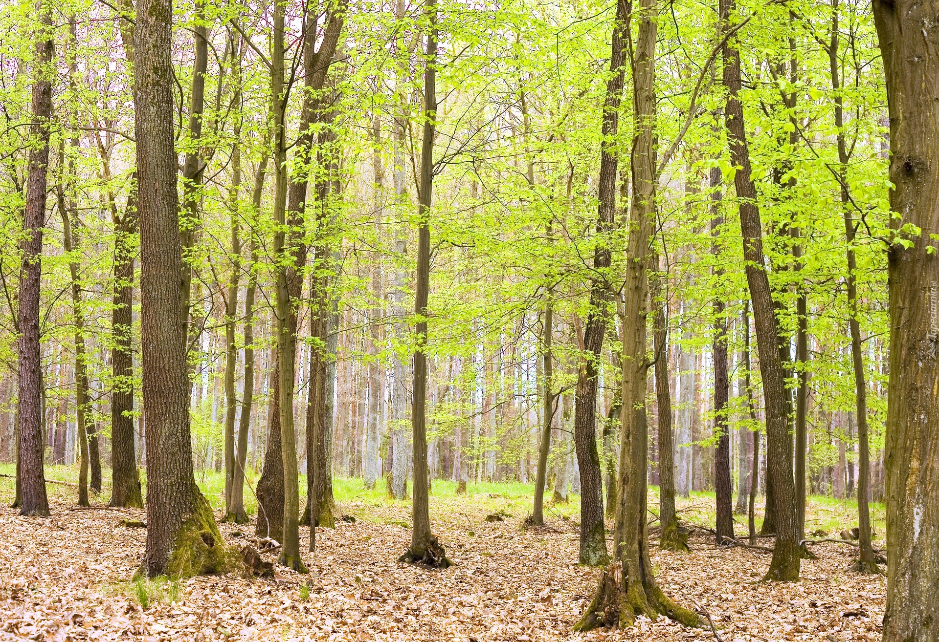 Edytor tapety: Opadłe liście pod drzewami w wiosennym lesie liściastym