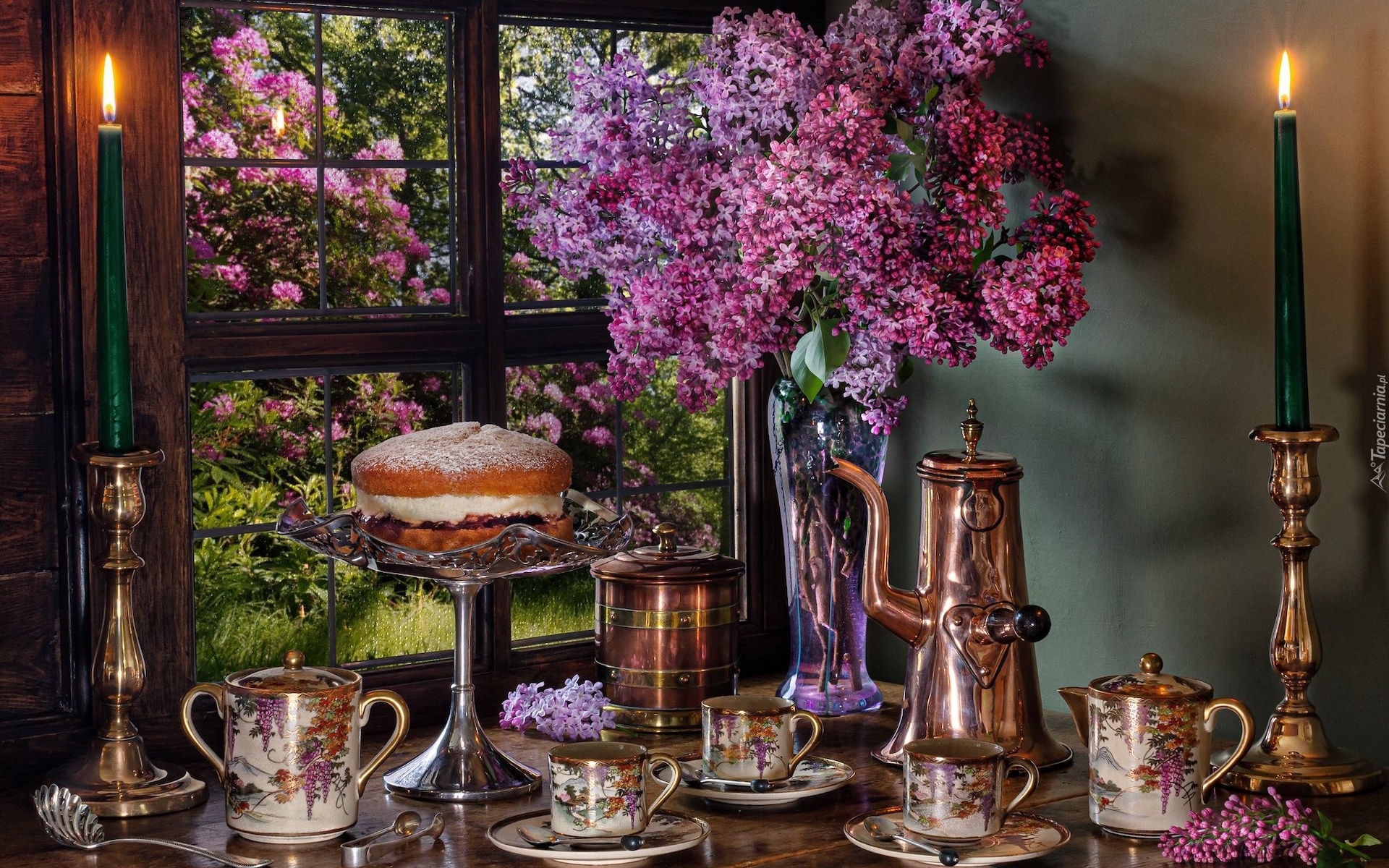 Edytor tapety: Tort i bukiet bzu przy oknie