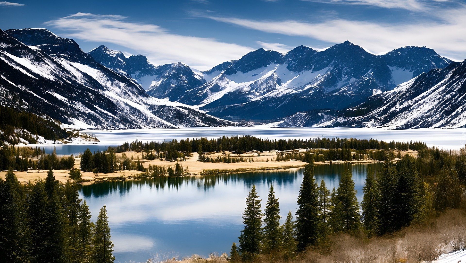 Edytor tapety: Ośnieżone góry i jezioro w dolinie