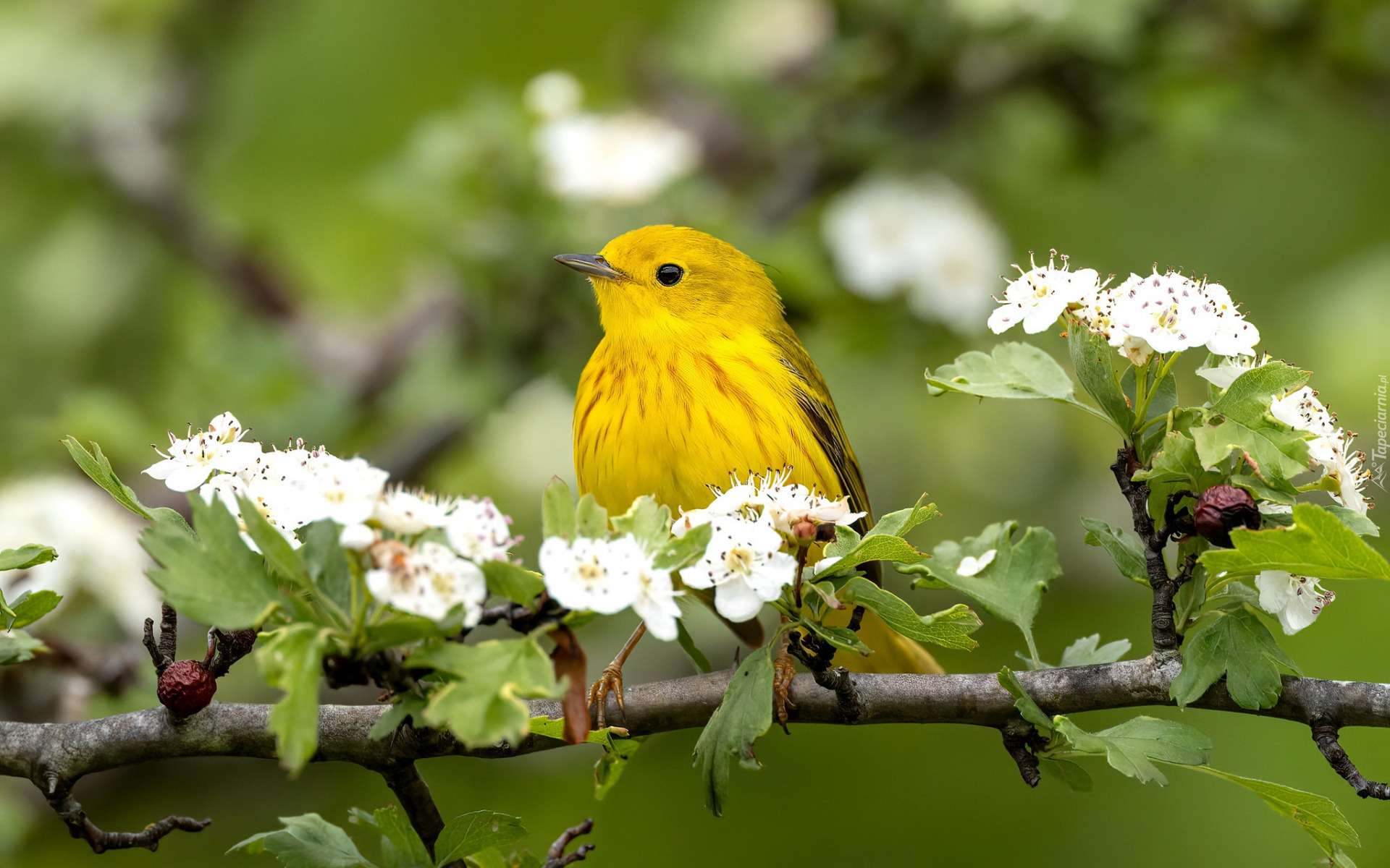 Edytor tapety: Lasówka złotawa na okwieconej gałązce