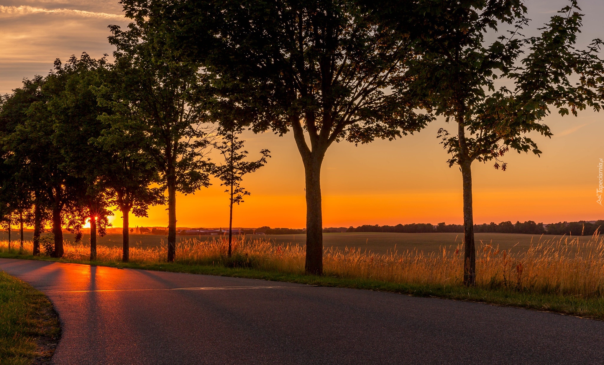 Edytor tapety: Drzewa przy drodze na tle malowniczego zachodu słońca
