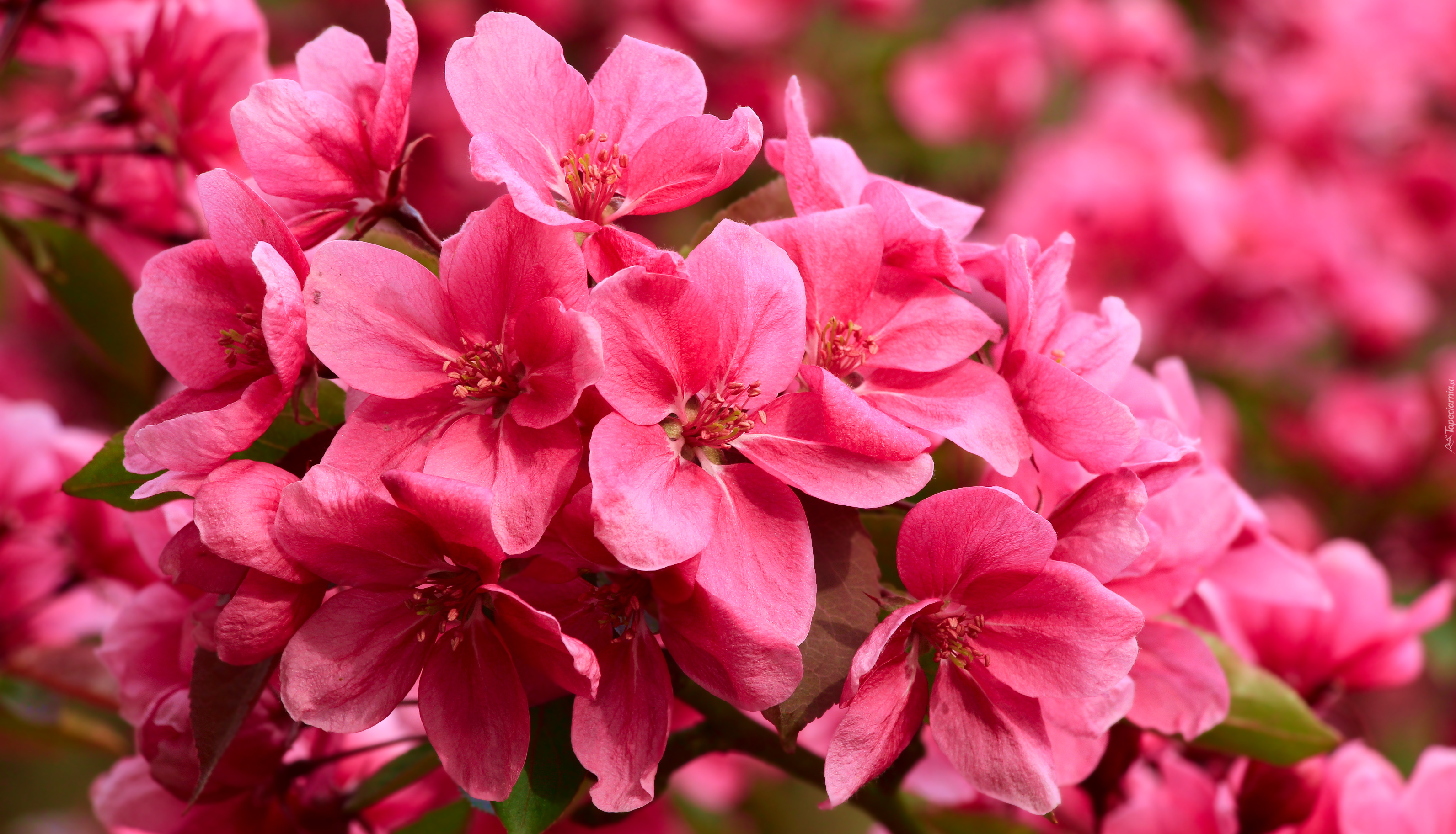 Edytor tapety: Rozświetlone różowe kwiaty drzewa owocowego w zbliżeniu