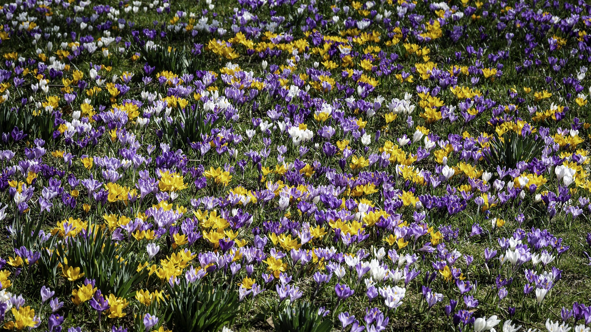 Edytor tapety: Rozświetlone kolorowe krokusy na łące
