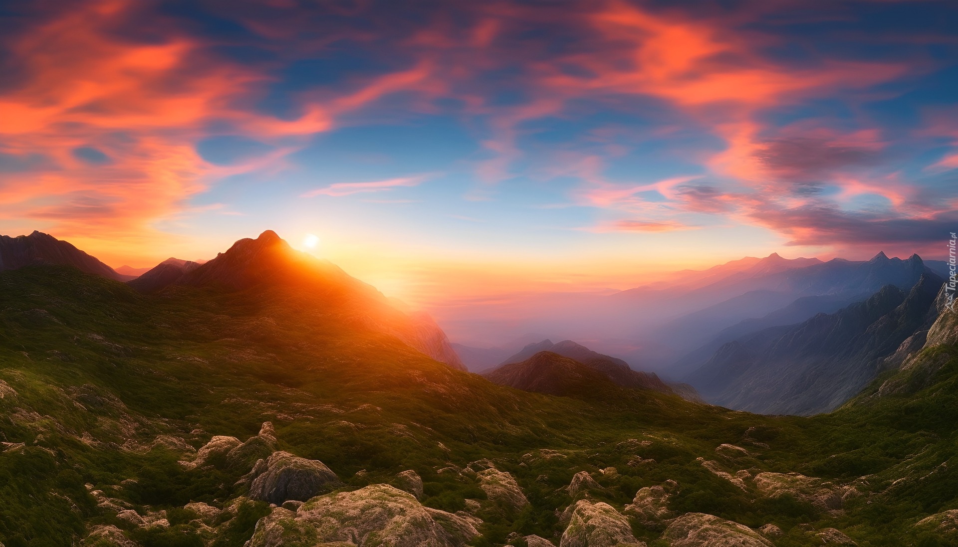 Edytor tapety: Górski krajobraz w blasku zachodzącego słońca