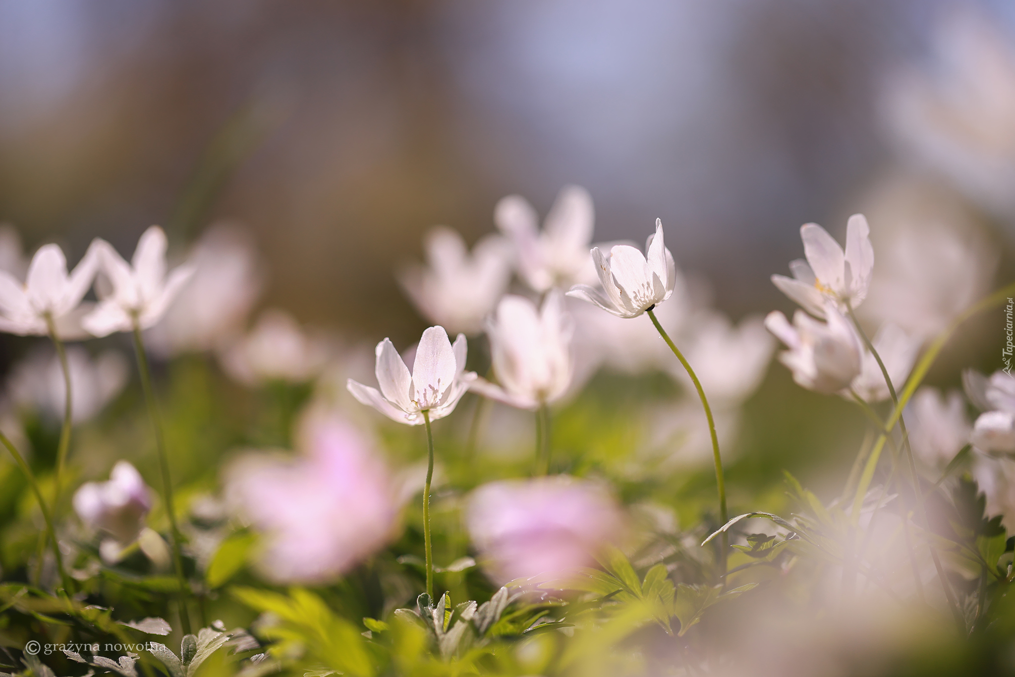 Edytor tapety: Rozmyte tło i białe zawilce gajowe