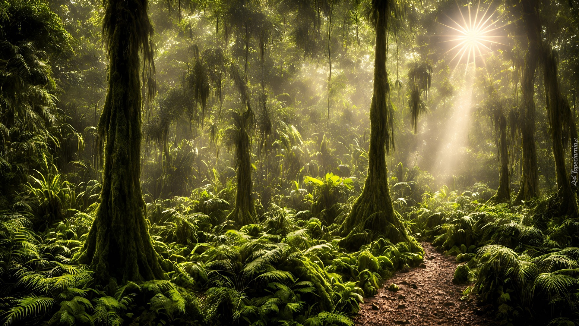Edytor tapety: Paprocie pod omszałymi drzewami w słonecznym blasku