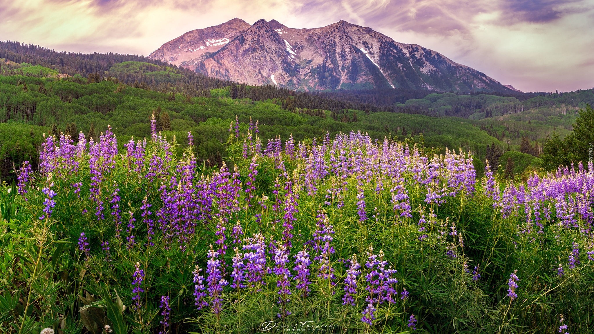 Edytor tapety: Kwitnące łubiny na tle stratowulkanu Mount Rainier