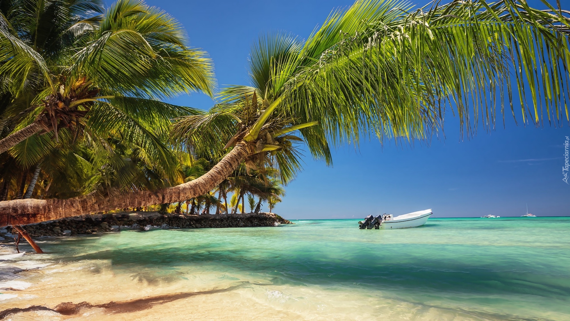 Edytor tapety: Pochylone palmy na plaży i motorówka na falach
