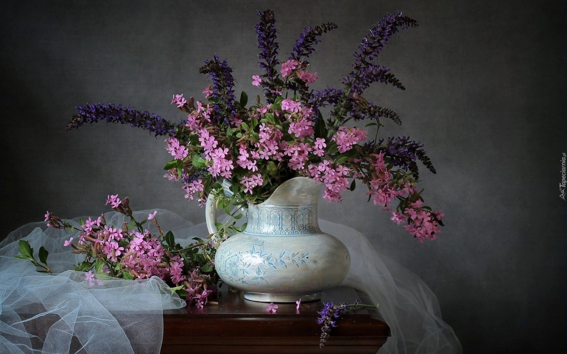 Edytor tapety: Bukiet kwiatów w porcelanowym dzbanku na komodzie
