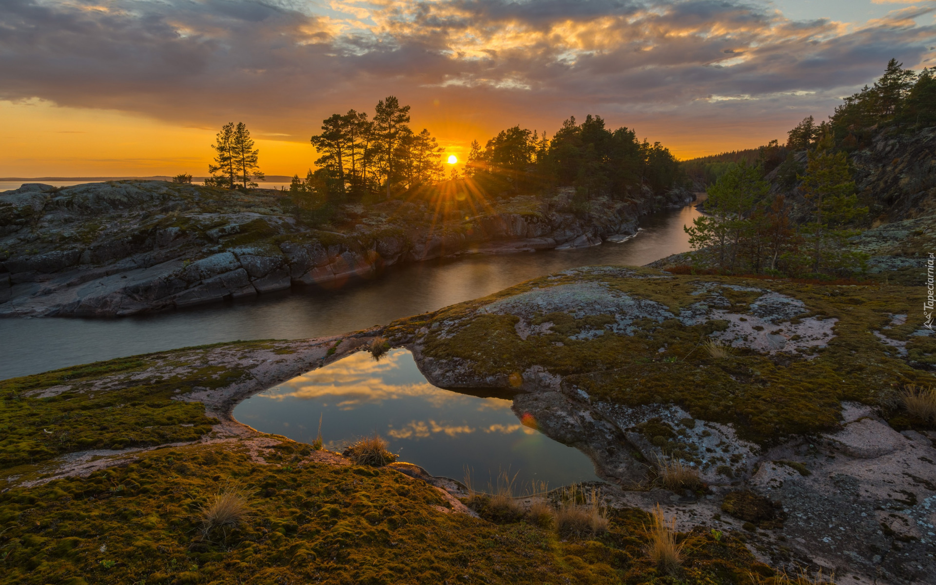 Edytor tapety: Promienie słońca nad drzewami na skałach