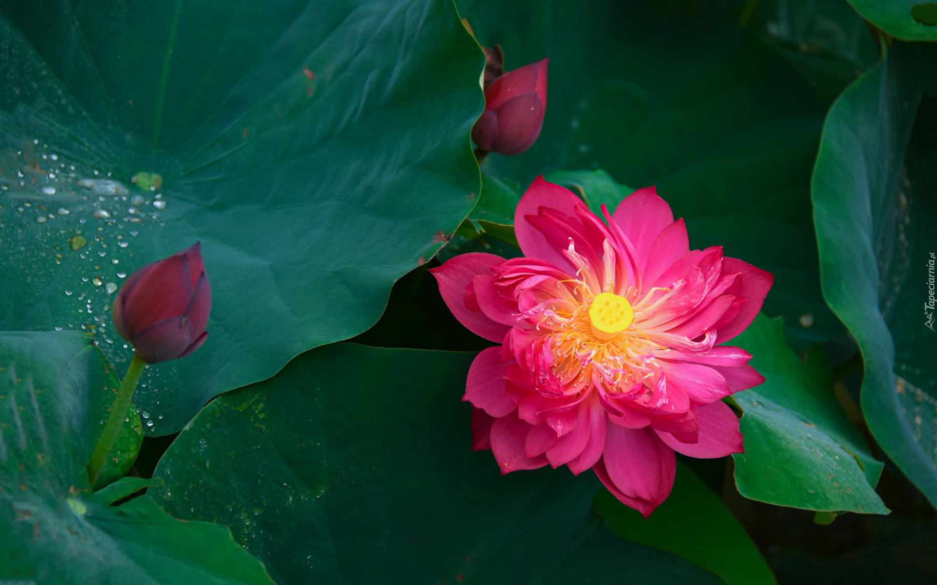 Edytor tapety: Różowy lotos i pąki na liściach