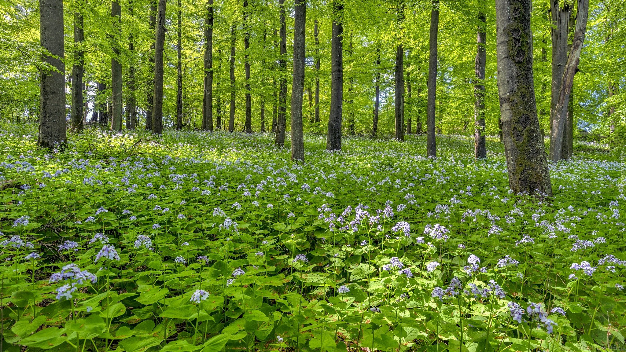 Edytor tapety: Kwiaty pod drzewami w zielonym lesie