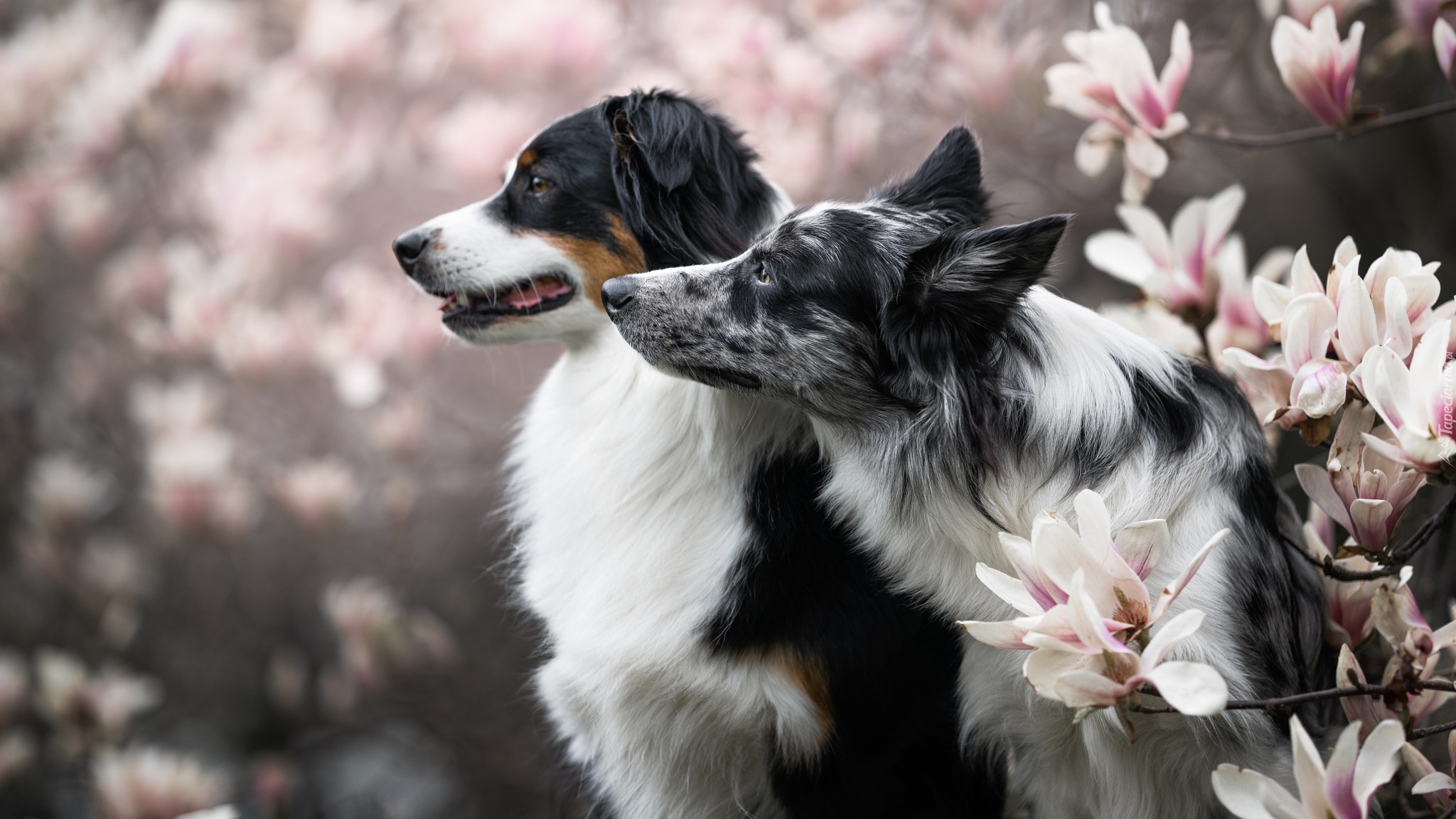Edytor tapety: Border collie i owczarek australijski obok magnolii