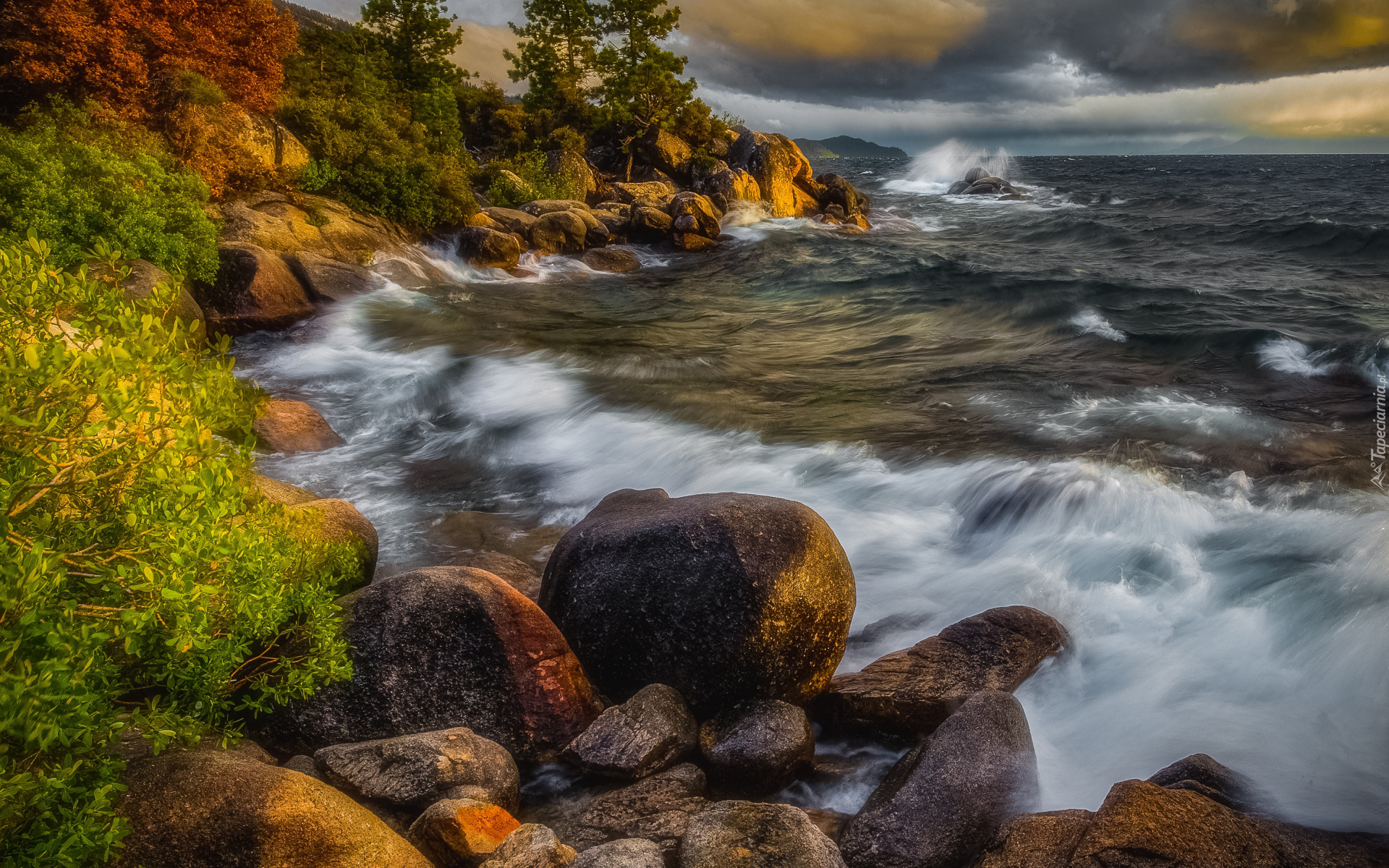 Edytor tapety: Fale na kamienistym brzegu wzburzonego jeziora