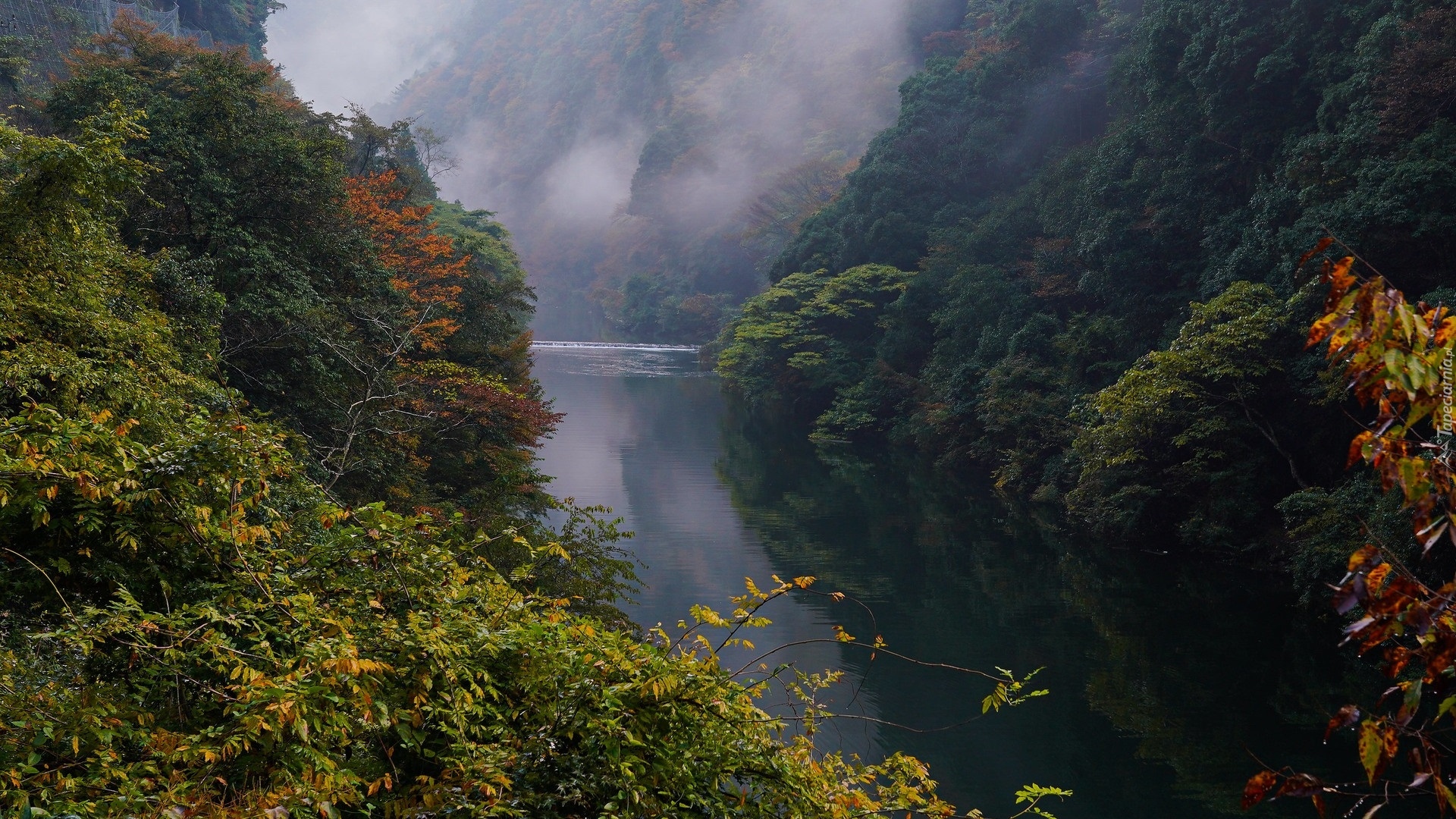 Edytor tapety: Rzeka i mgła nad zalesionymi górami