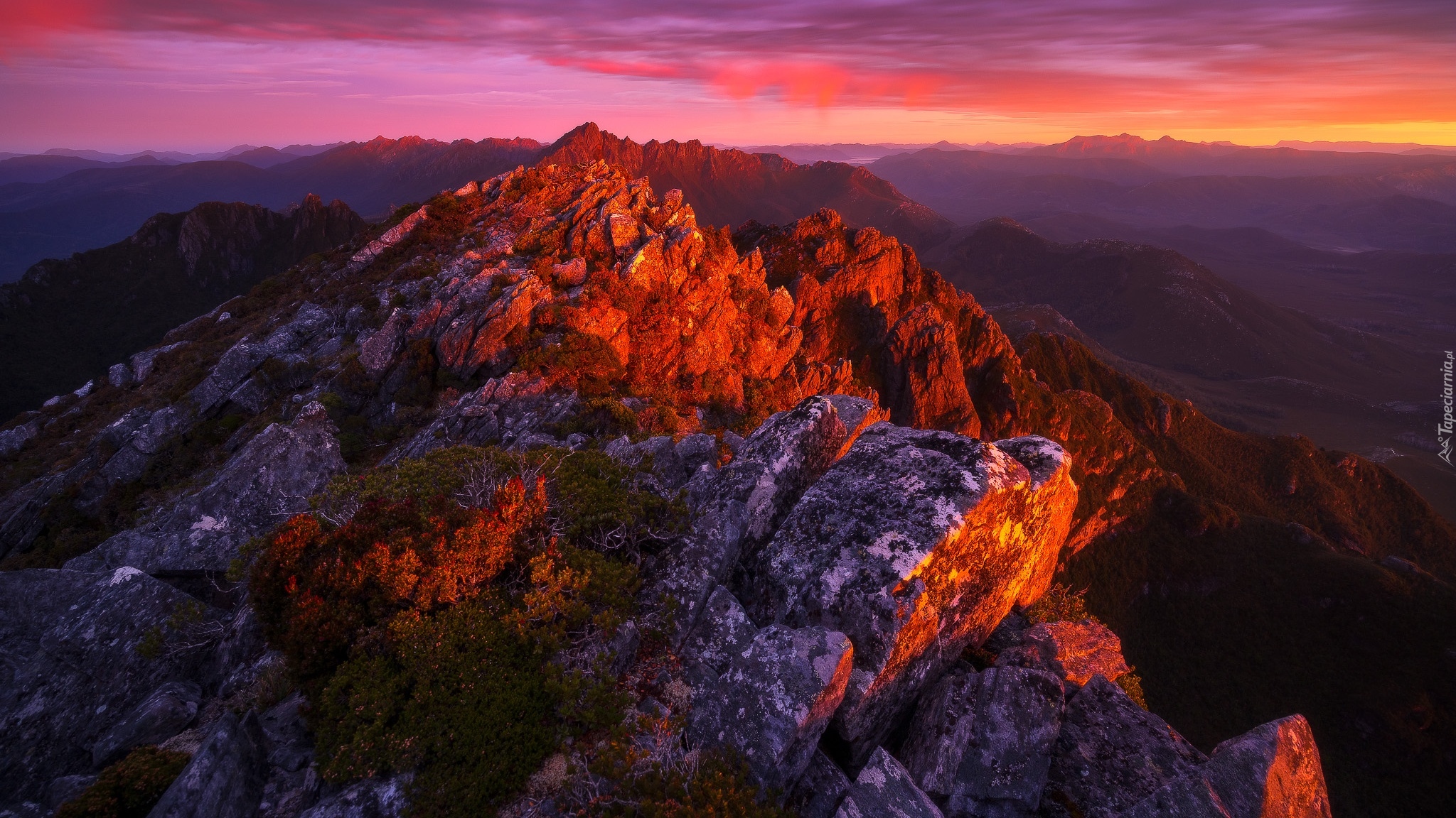 Edytor tapety: Rozświetlone blaskiem zachodzącego słońca góry Arthur Range
