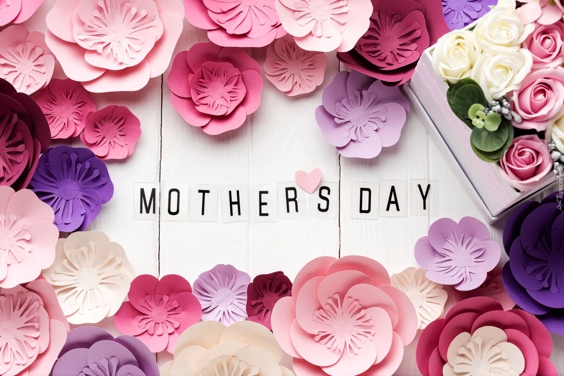 Edytor tapety: Kwiaty i napis Mothers Day na białych deskach