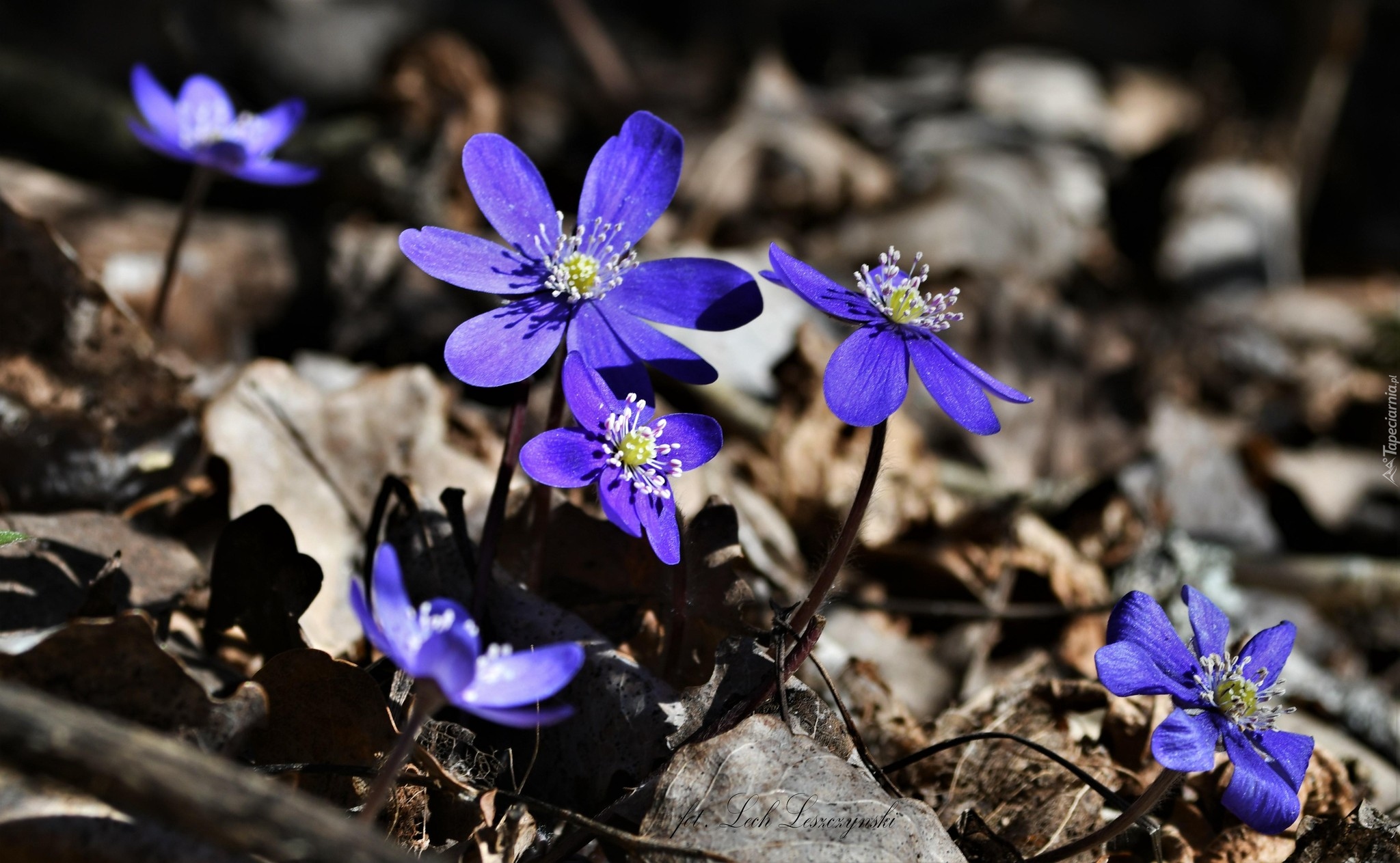 Edytor tapety: Rozświetlone niebieskie przylaszczki w suchych liściach