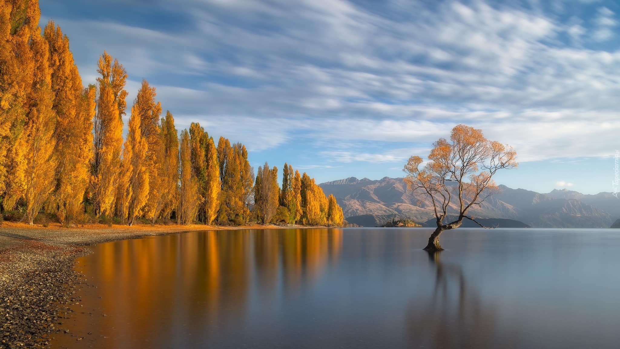 Edytor tapety: Jesienne drzewa nad jeziorem Wanaka