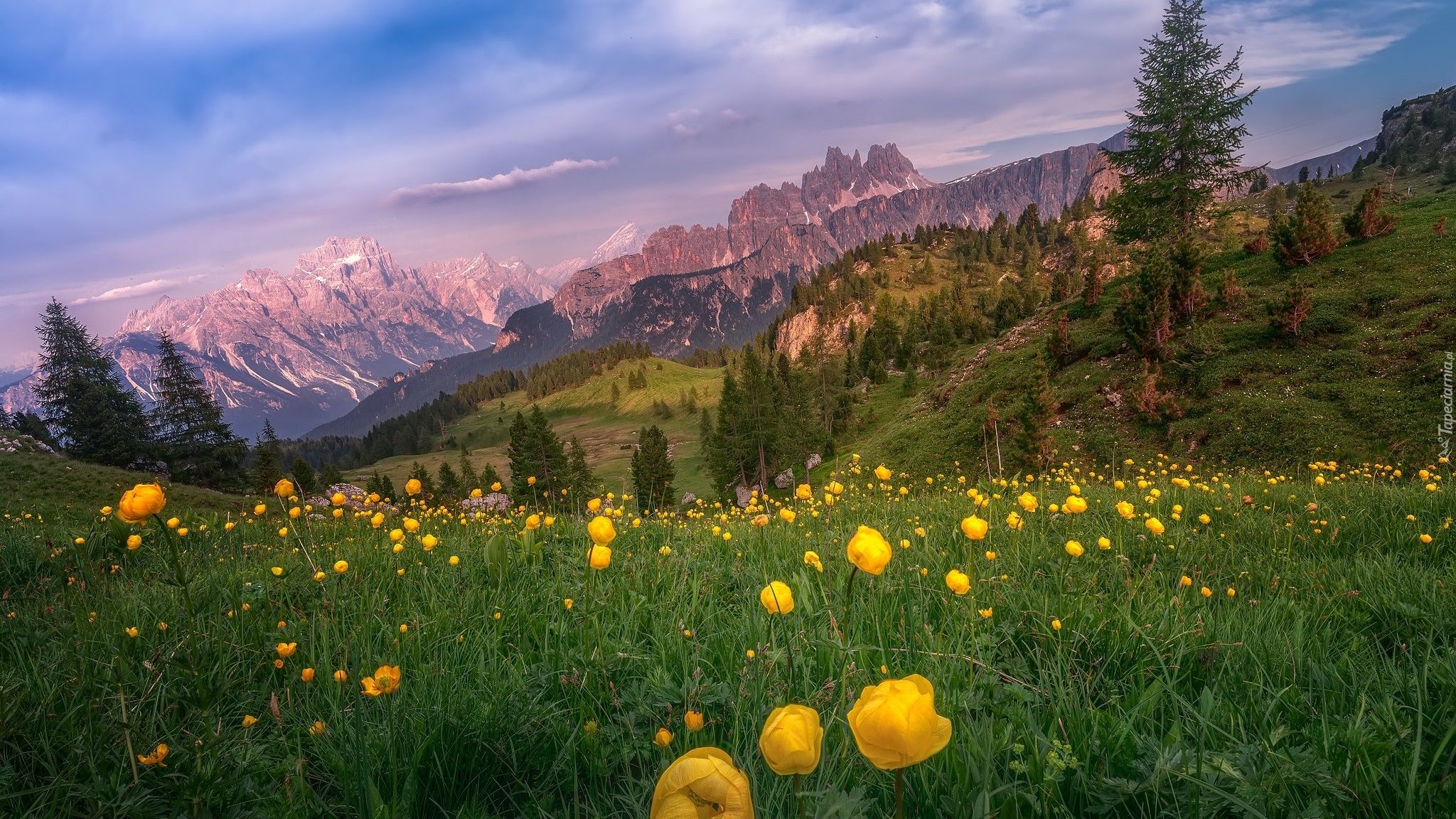 Edytor tapety: Kwiaty na łące z widokiem na Dolomity