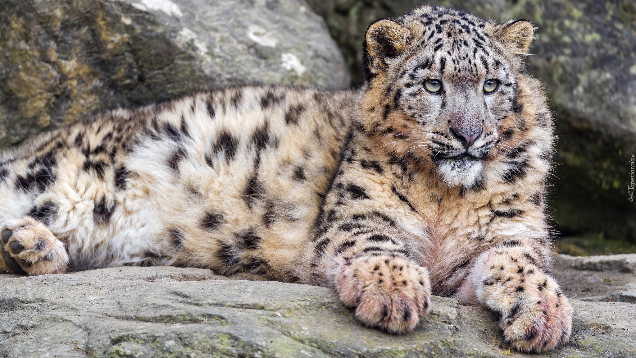 Edytor tapety: Leżący irbis pod skałą